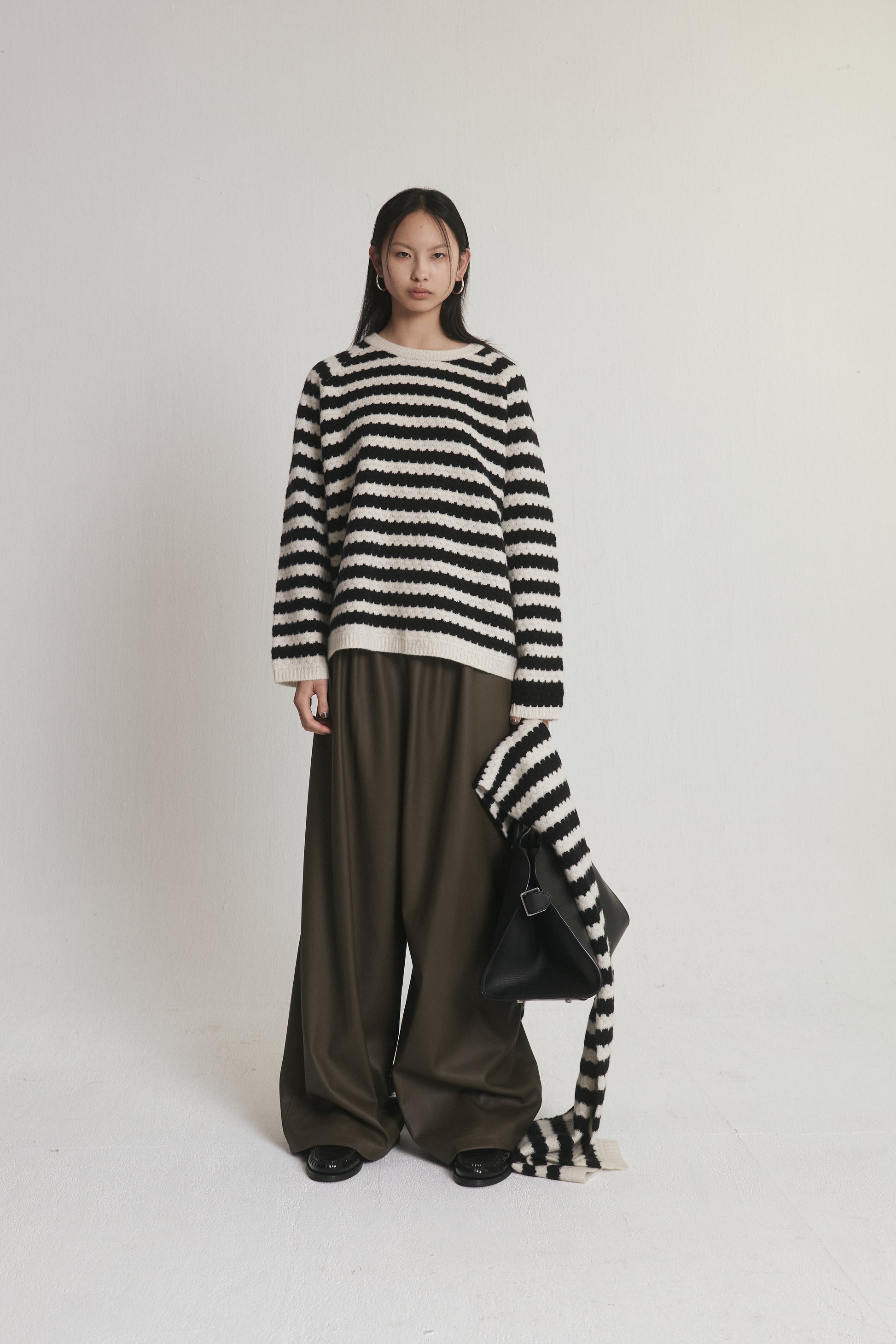 This sweater is crafted from 100% merino wool. It features a round neckline, dropped shoulders, long sleeves, and a straight hem. Ribbing surrounds the neckline, cuffs, and hem. It pairs perfectly with the Wool Scarf in Stripes. (Please note that the scarf in the picture is selling separately)