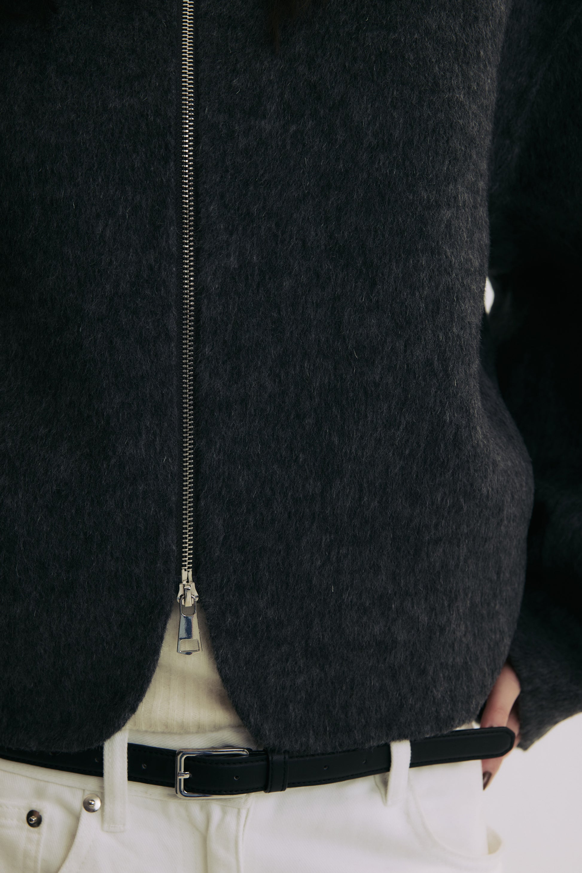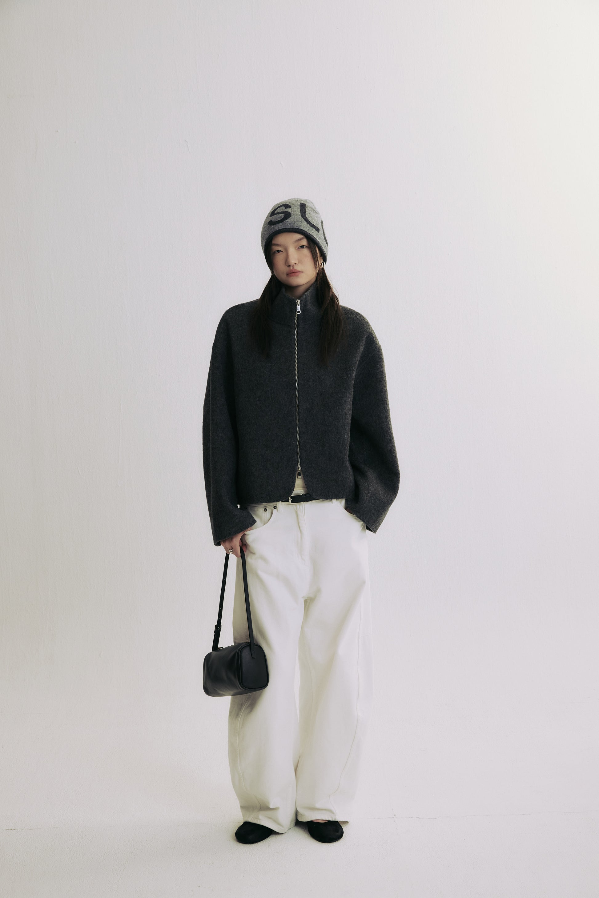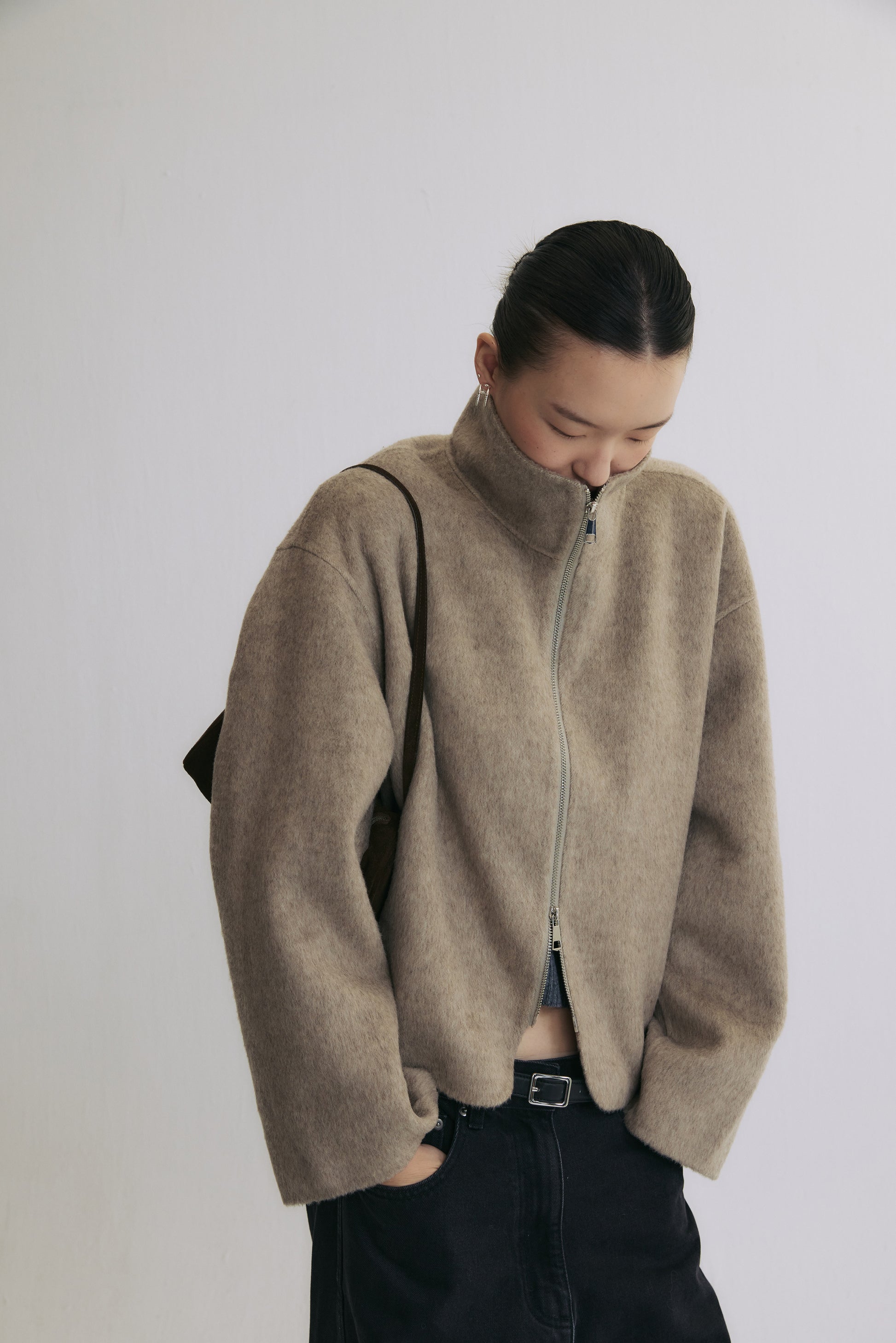 Made from imported double-faced wool blend with alpaca and bouclé, this coat balances warmth, softness, and structure. The fabric is airy yet resilient, with a natural luster and supple drape that enhances both comfort and visual refinement. Its dense weave ensures insulation without bulk, offering a tactile softness free of irritation.
