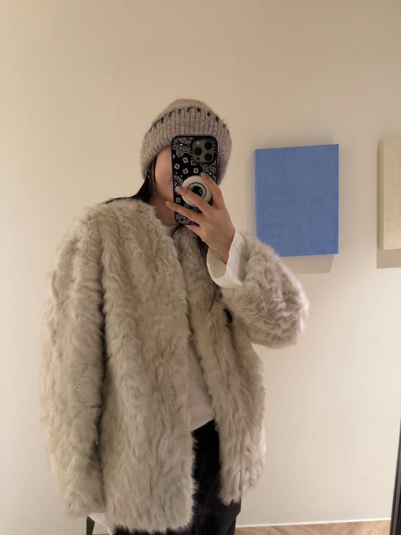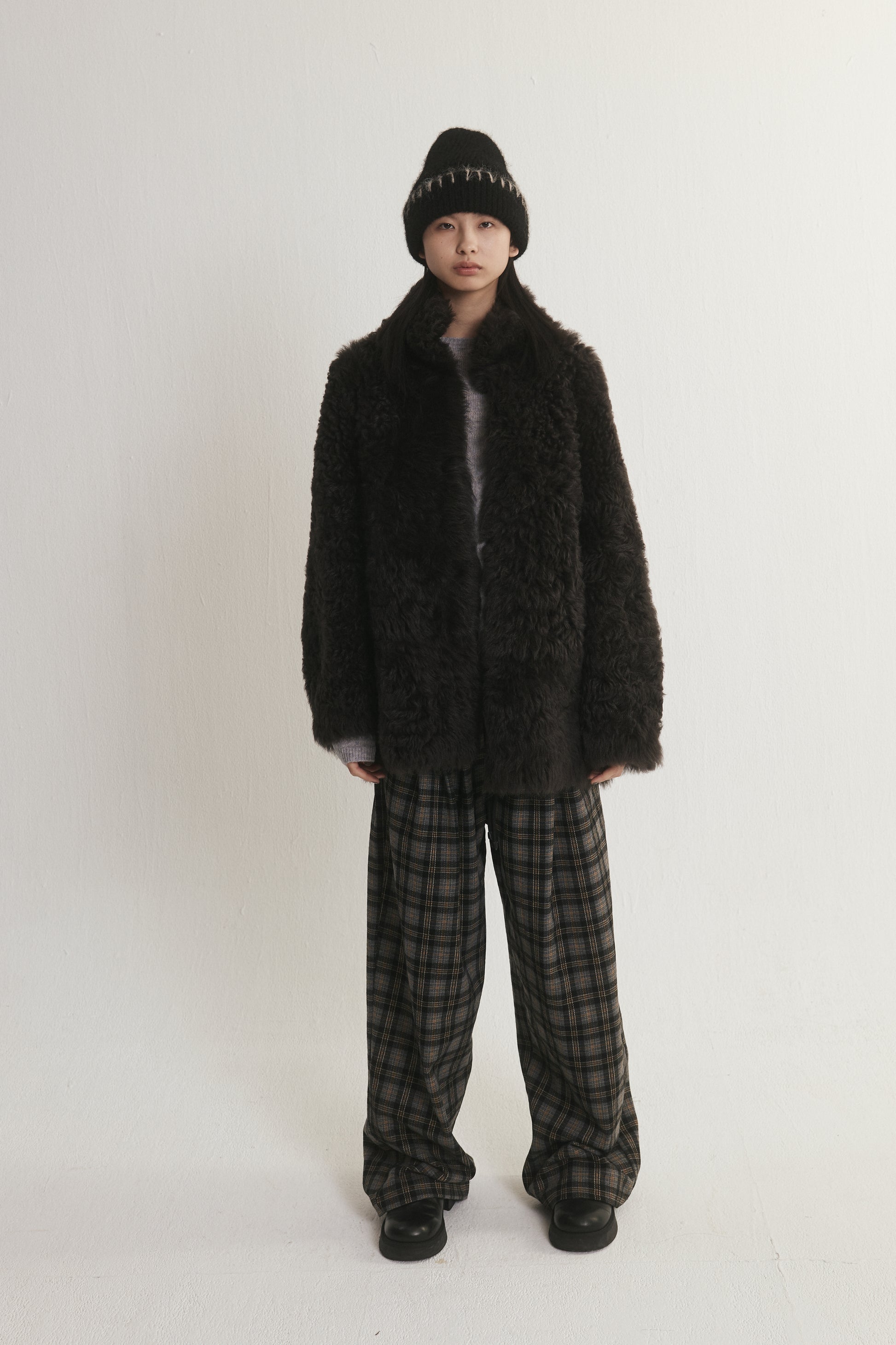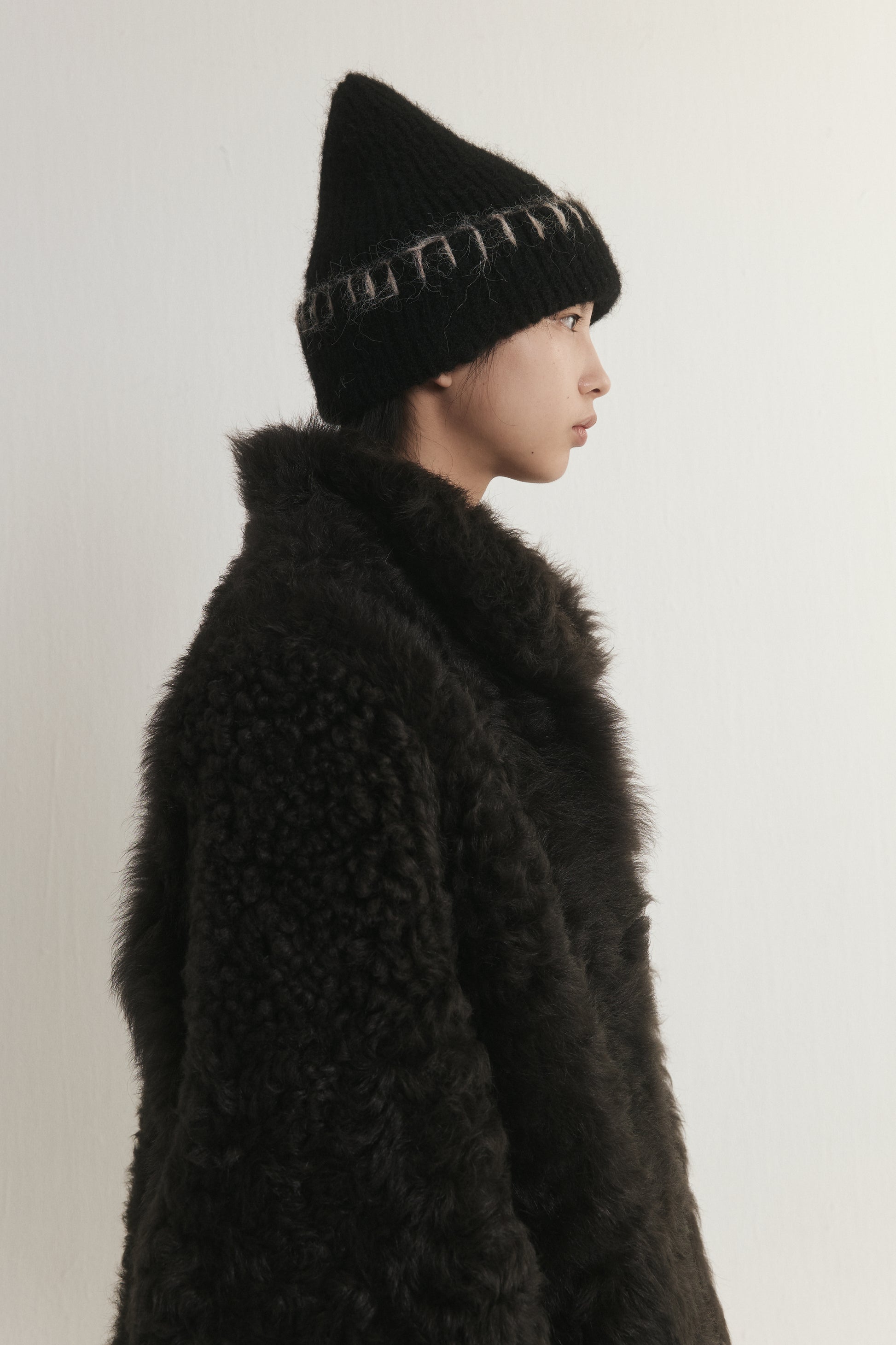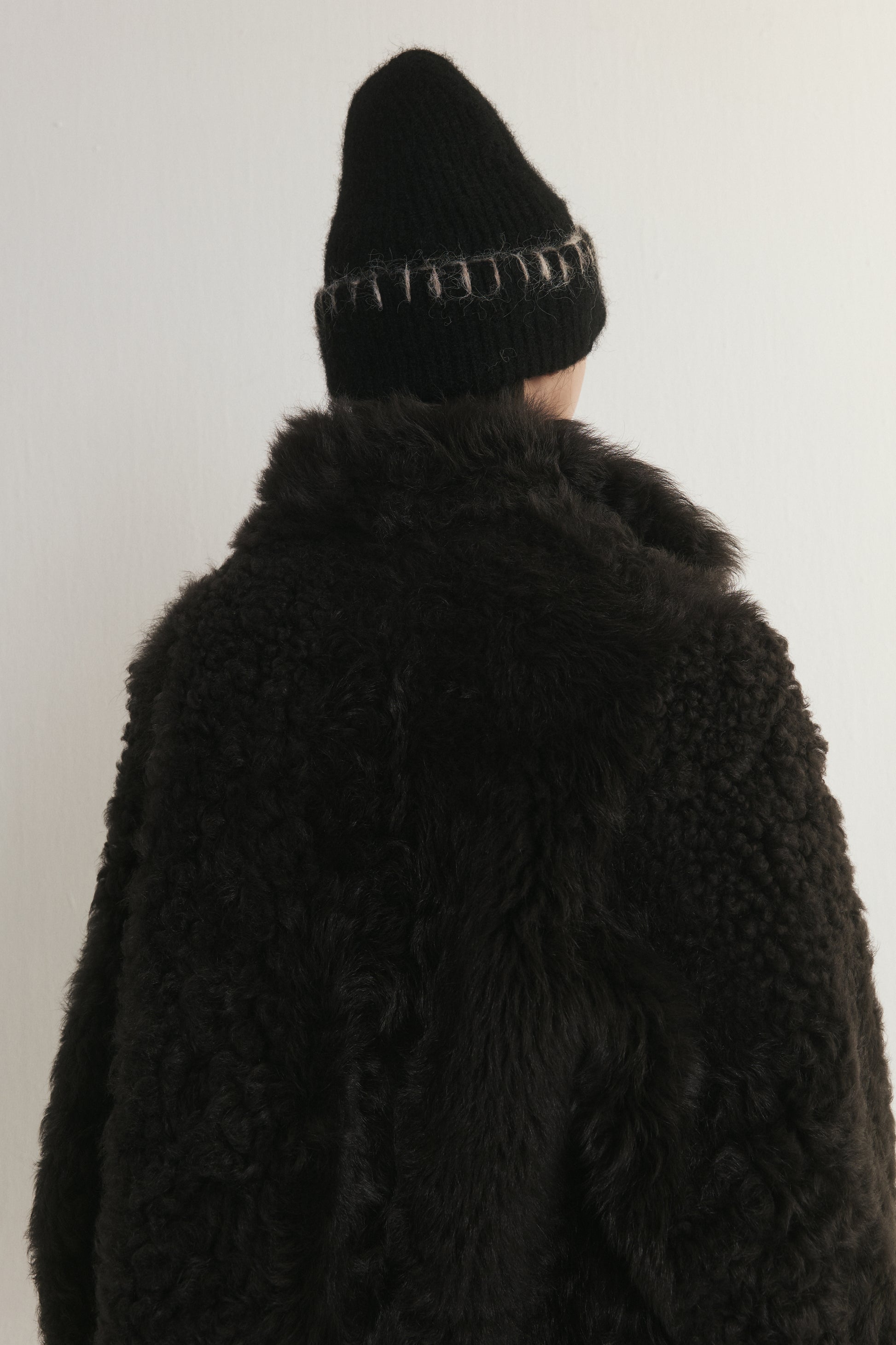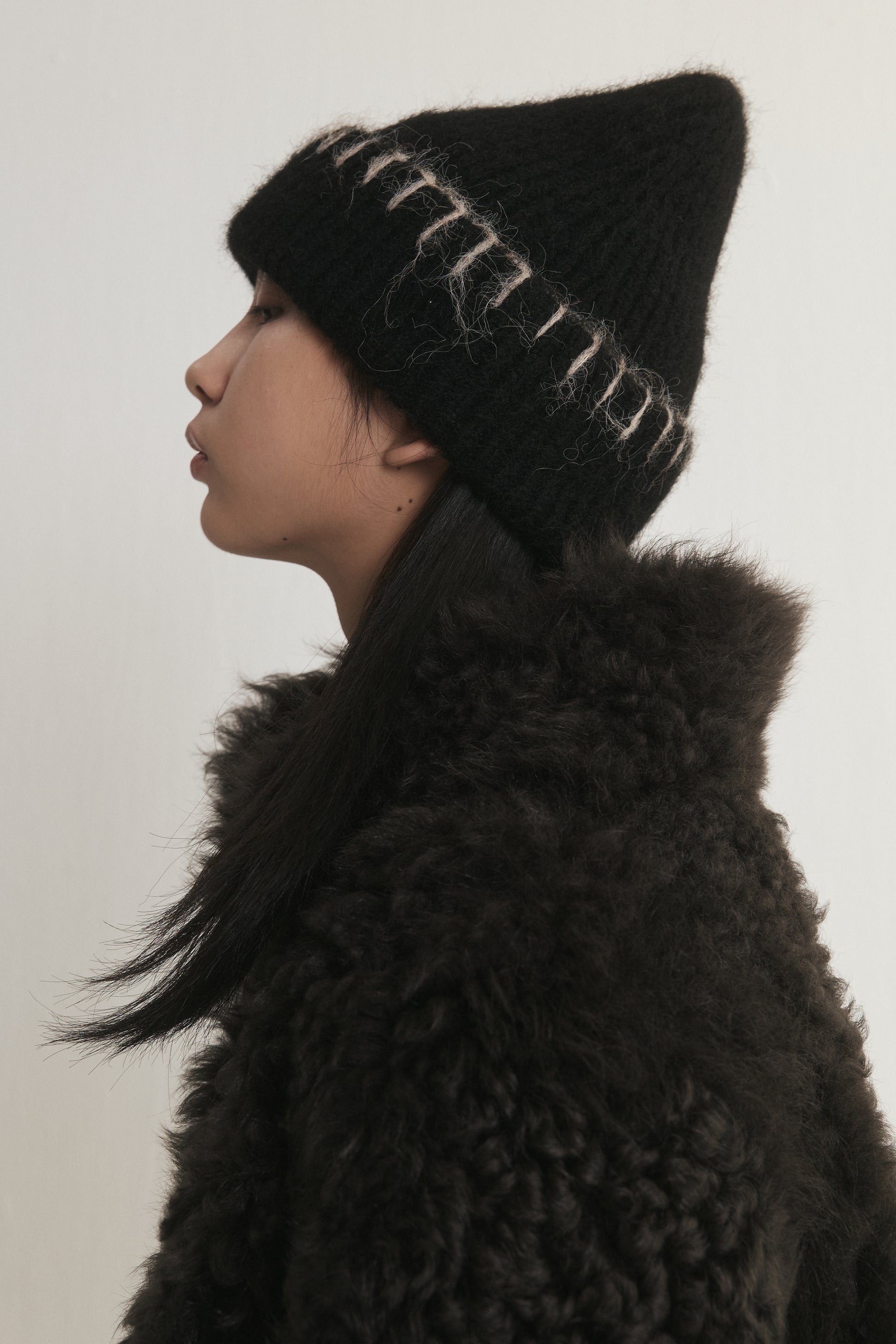Offered in a charcoal black and beige shade, this cozy beanie is knitted from a wool blend. It's ribbed to keep warmth in and has a soft, fuzzy hand feel and a wide fold-up brim.
