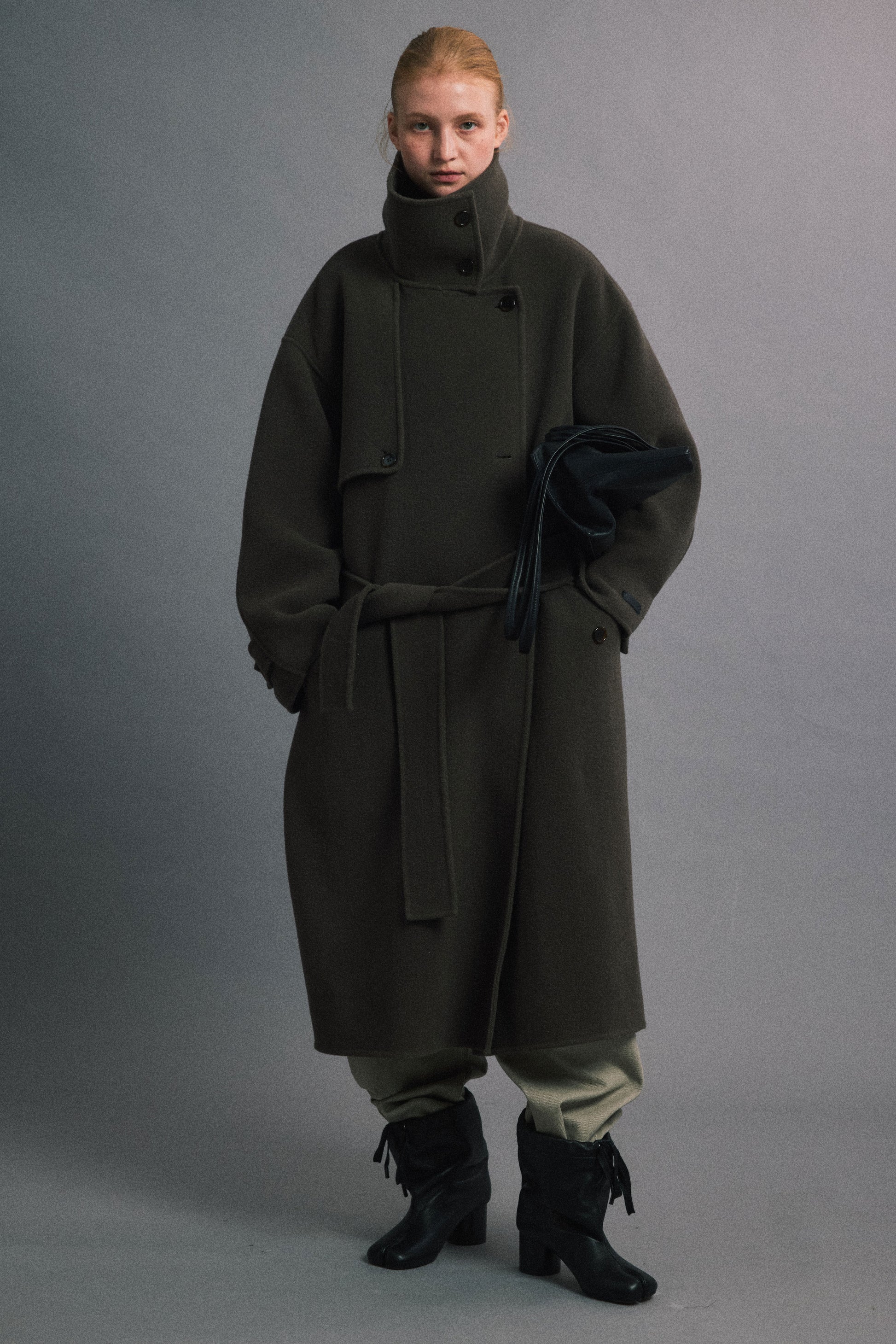 Crafted from 100% premium wool with a plush double-faced finish, this coat is a statement in both elegance and function. The tailored silhouette features a structured lapel that can be worn up or down, a concealed front placket, and a wind flap detail that adds architectural flair. Side pockets and a detachable waist belt enhance both form and practicality. Mid-calf length ensures full coverage during colder months, while the airy yet dense texture cocoons the body with gentle warmth.