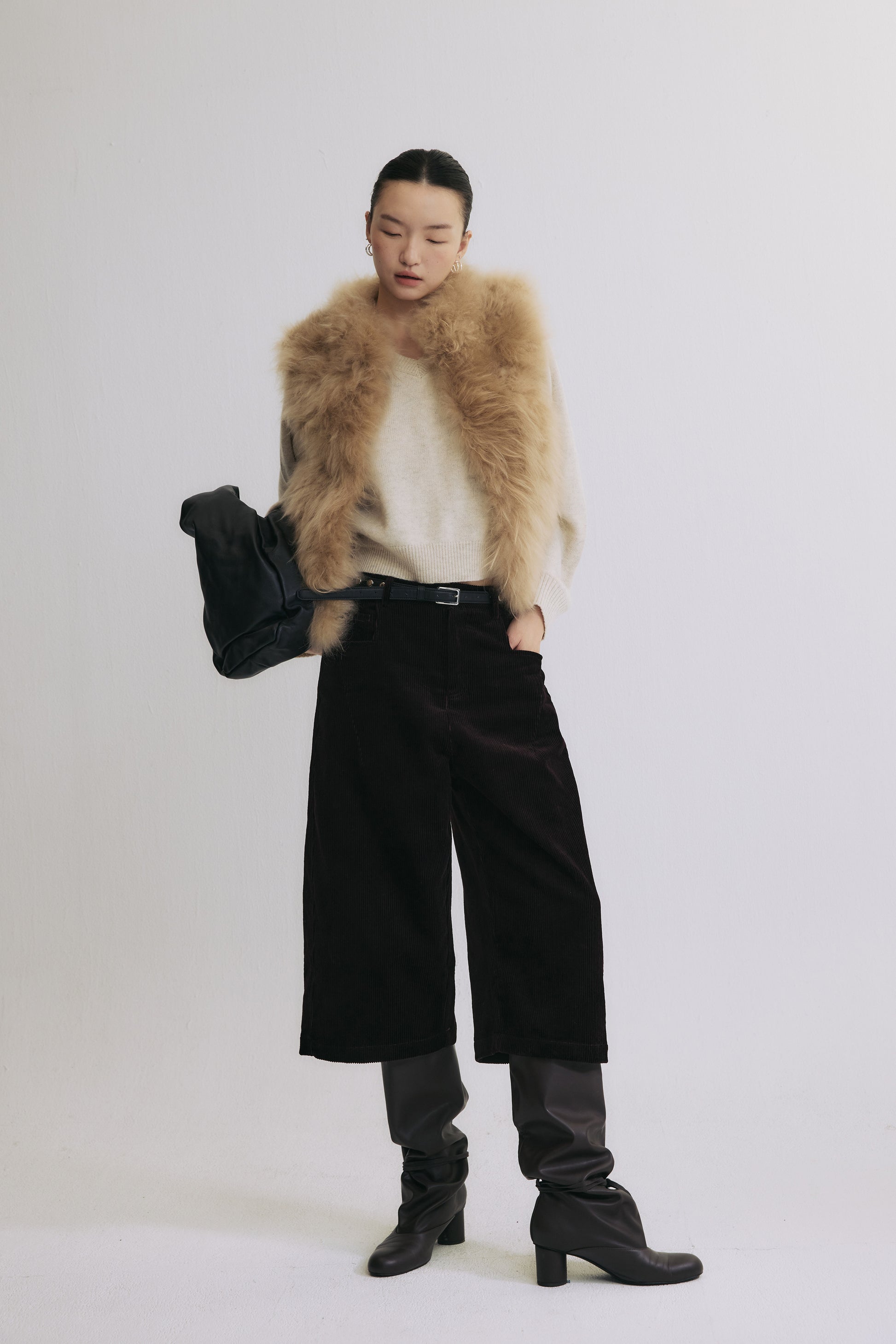 Crafted from 100% premium cashmere sourced from young goats in their first shearing, this vest embodies refinement and comfort in equal measure. The natural fibers are exceptionally soft, lightweight, and resilient, forming a plush insulating layer that shields against the cold while remaining airy to wear. Its surface has a natural, fluffy loft with subtle curls and sheen, offering both warmth and elegance.