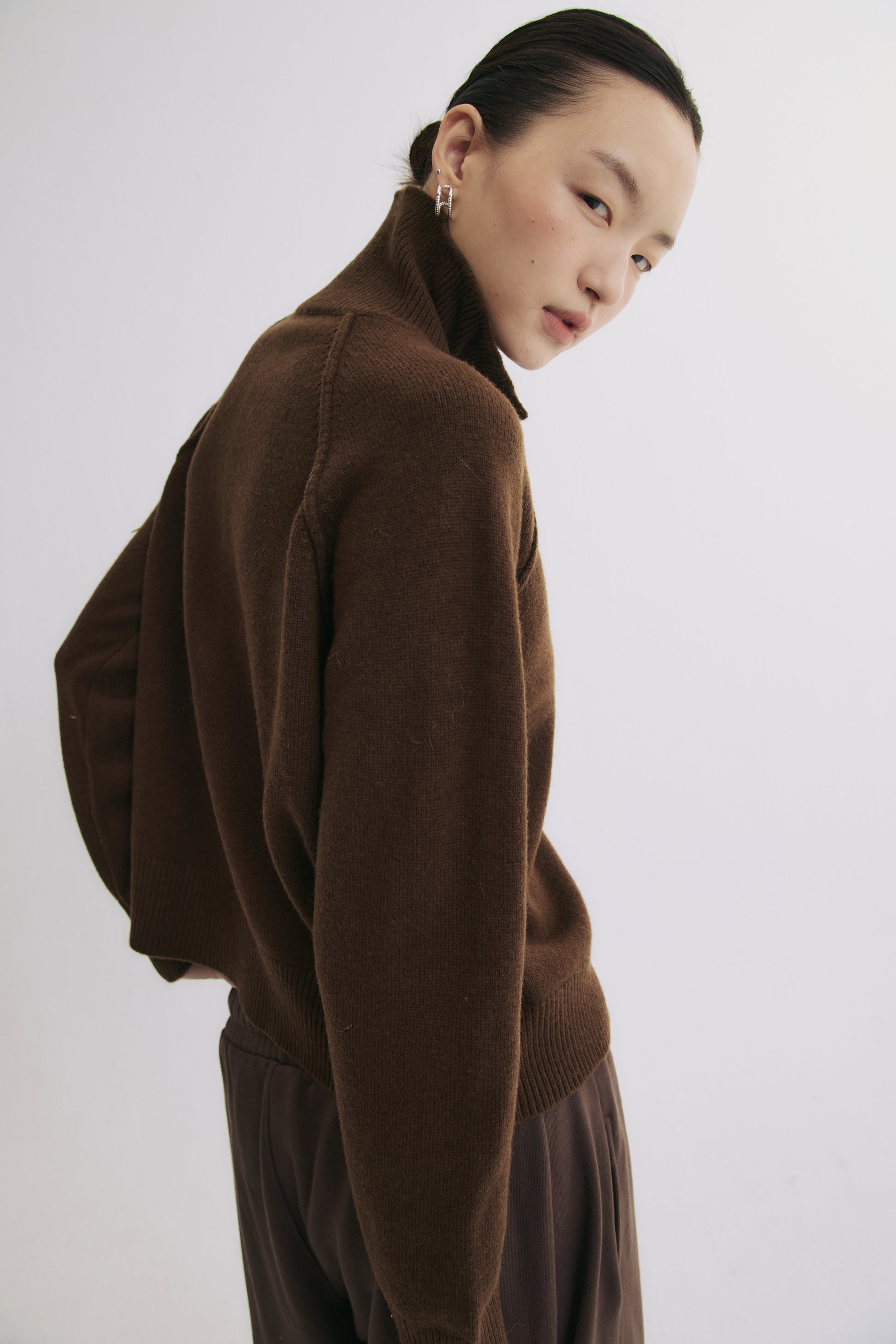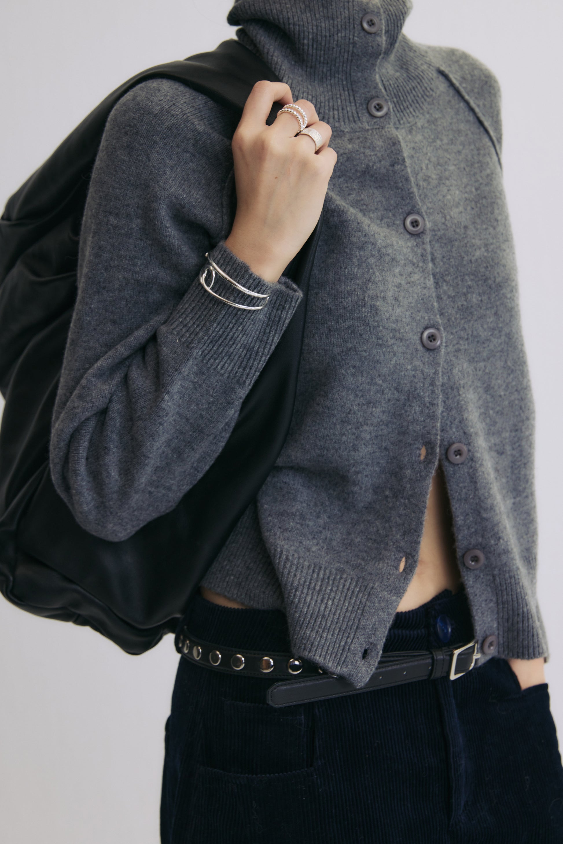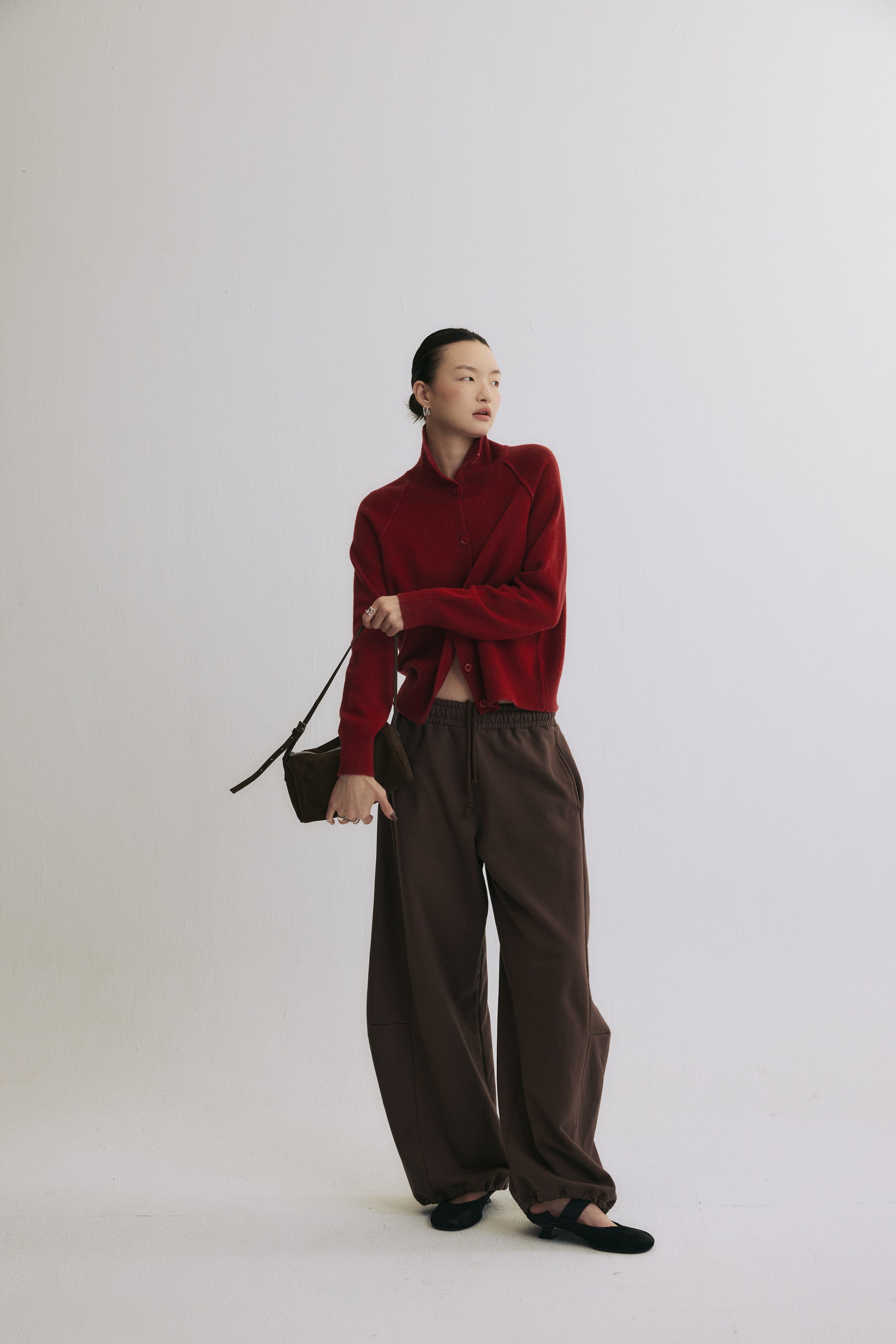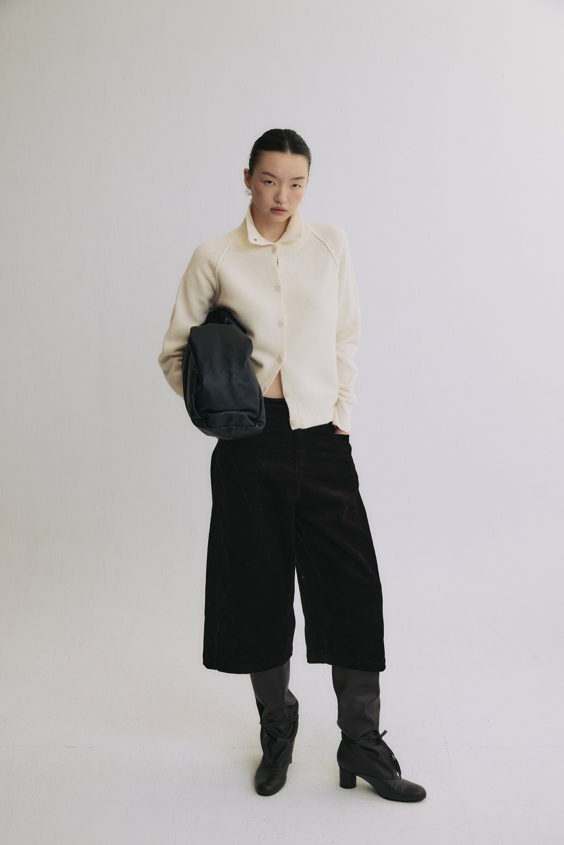 Crafted from 100% Australian Merino wool, this mid-gauge cardigan is lightweight yet thermally efficient. The soft, skin-friendly texture hugs the body like a warm cocoon, perfect for chillier seasons. With a slightly relaxed silhouette, it layers smoothly without adding bulk. The structured high collar can be worn folded or upright to define the neckline and elevate the overall styling. Button placket and tailored hem details offer a clean, composed finish whether worn open or closed.