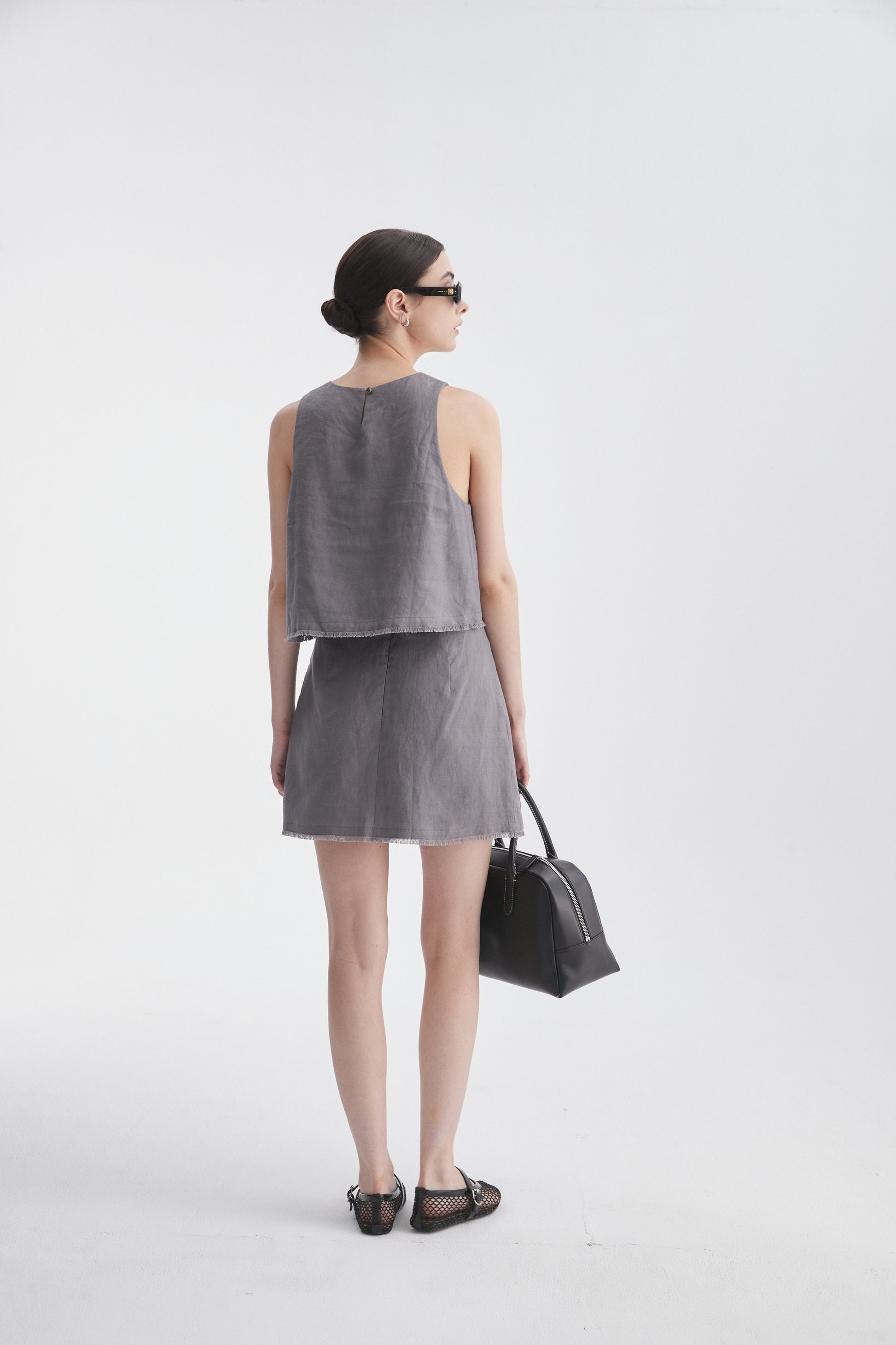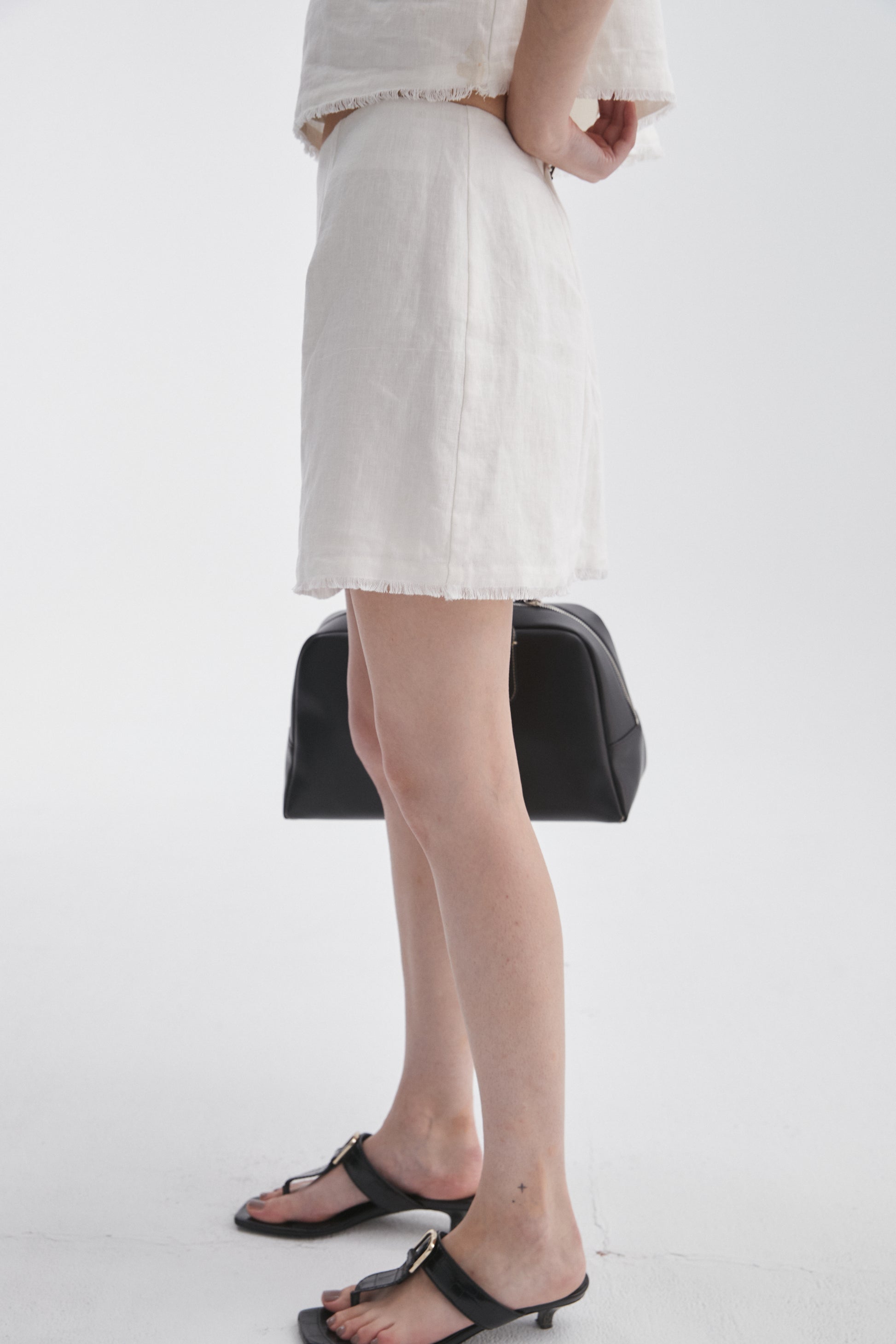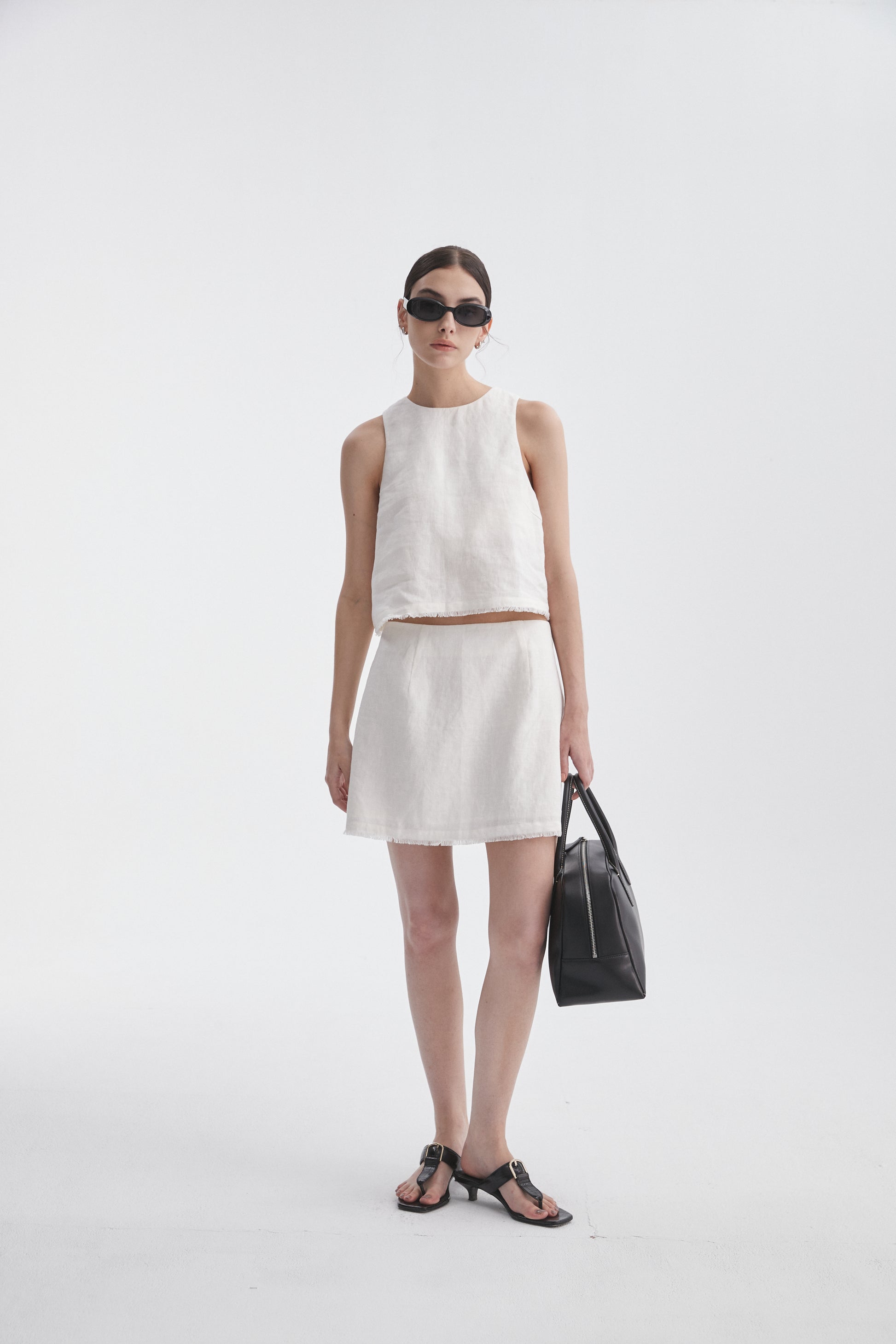 Add a touch of minimalism to your wardrobe with this mini skirt. Its A-line silhouette and raw hem create a contemporary look perfect for any occasion. This skirt is made from a soft, breathable 100% linen and offers style and comfort. Pair it with the matching cropped top for a complete look, or match it with other tops for versatile styling options.
