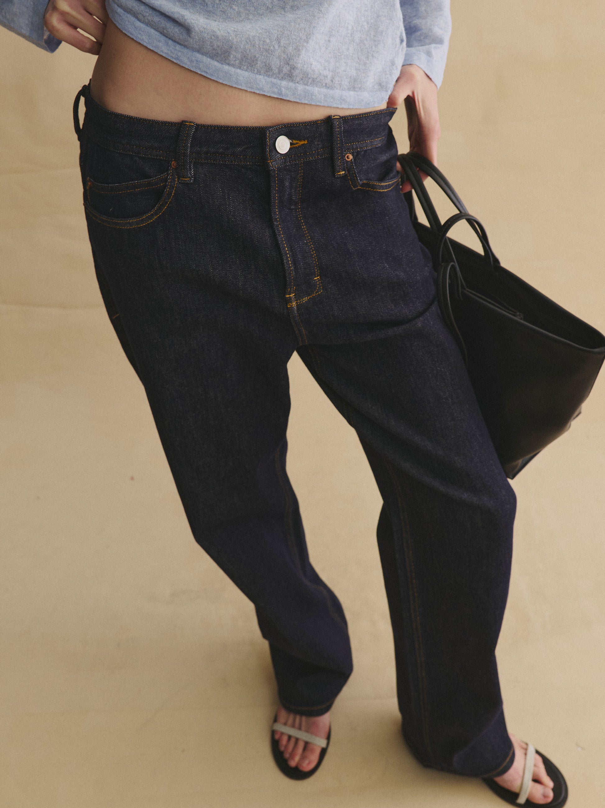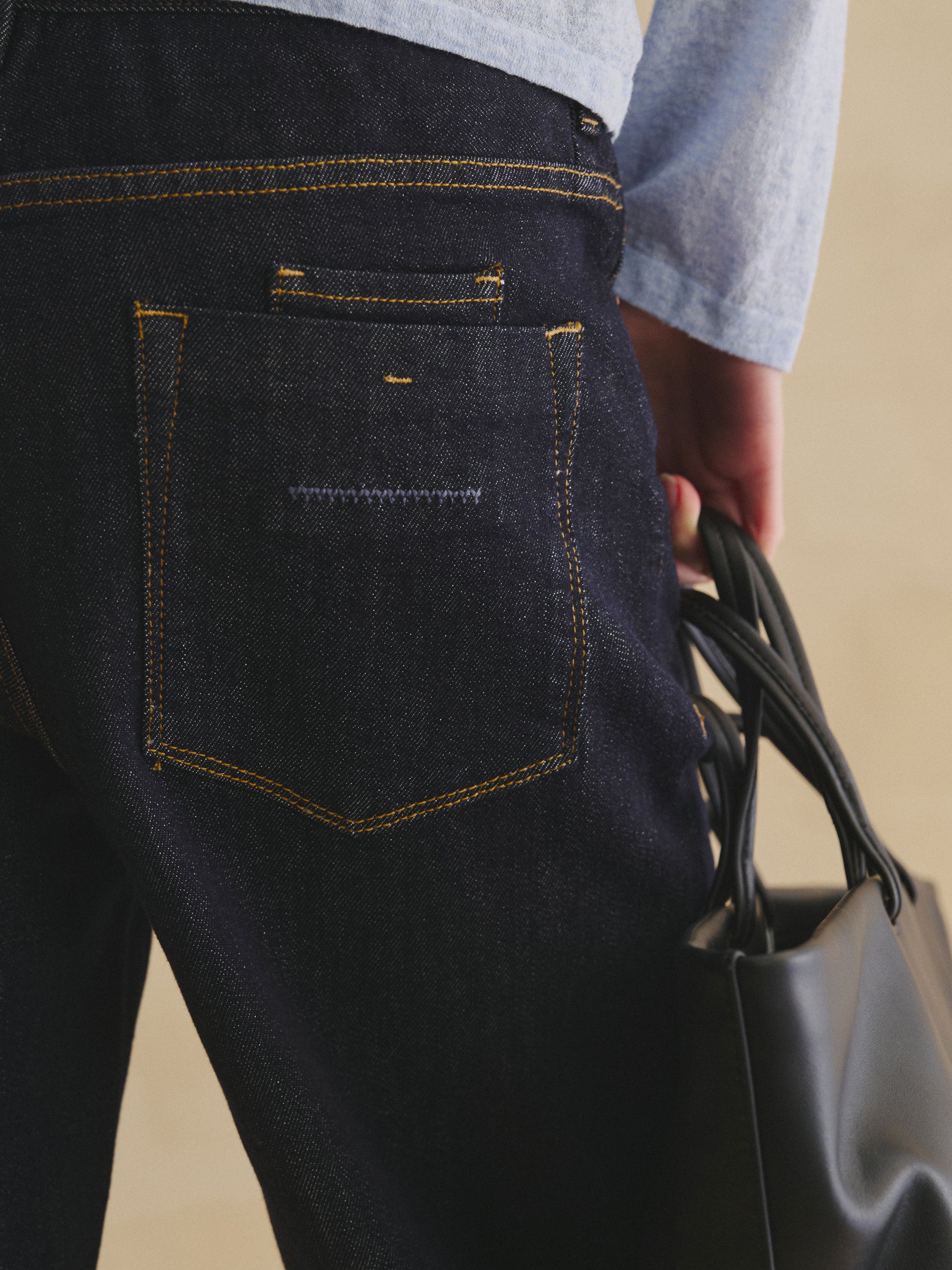 Made from 100% cotton denim with a dense, textured weave, these straight-leg jeans offer structure, durability, and a naturally crisp drape. Compared to standard denim, the fabric holds its shape better over time and resists sagging, making it a reliable everyday essential.