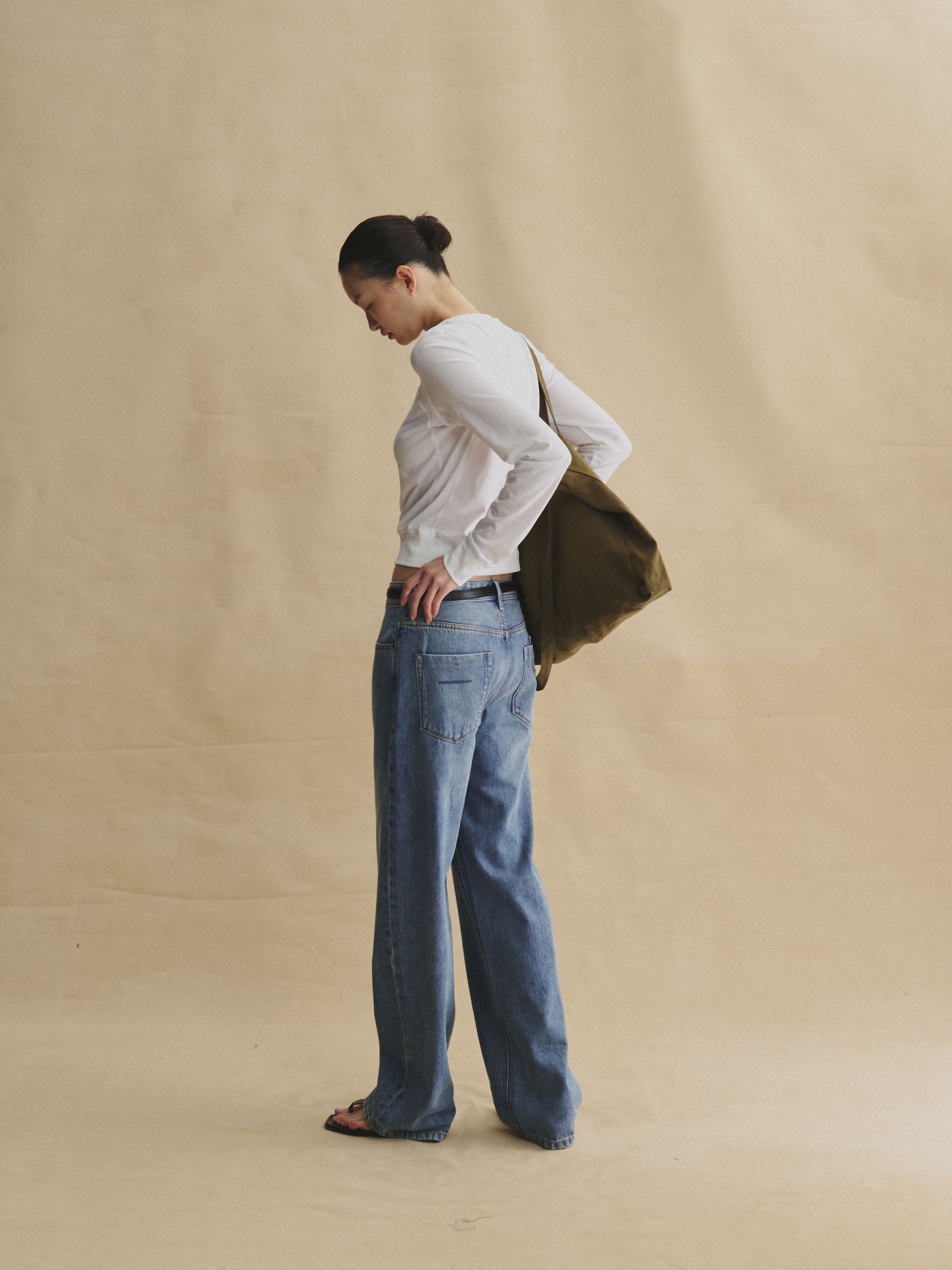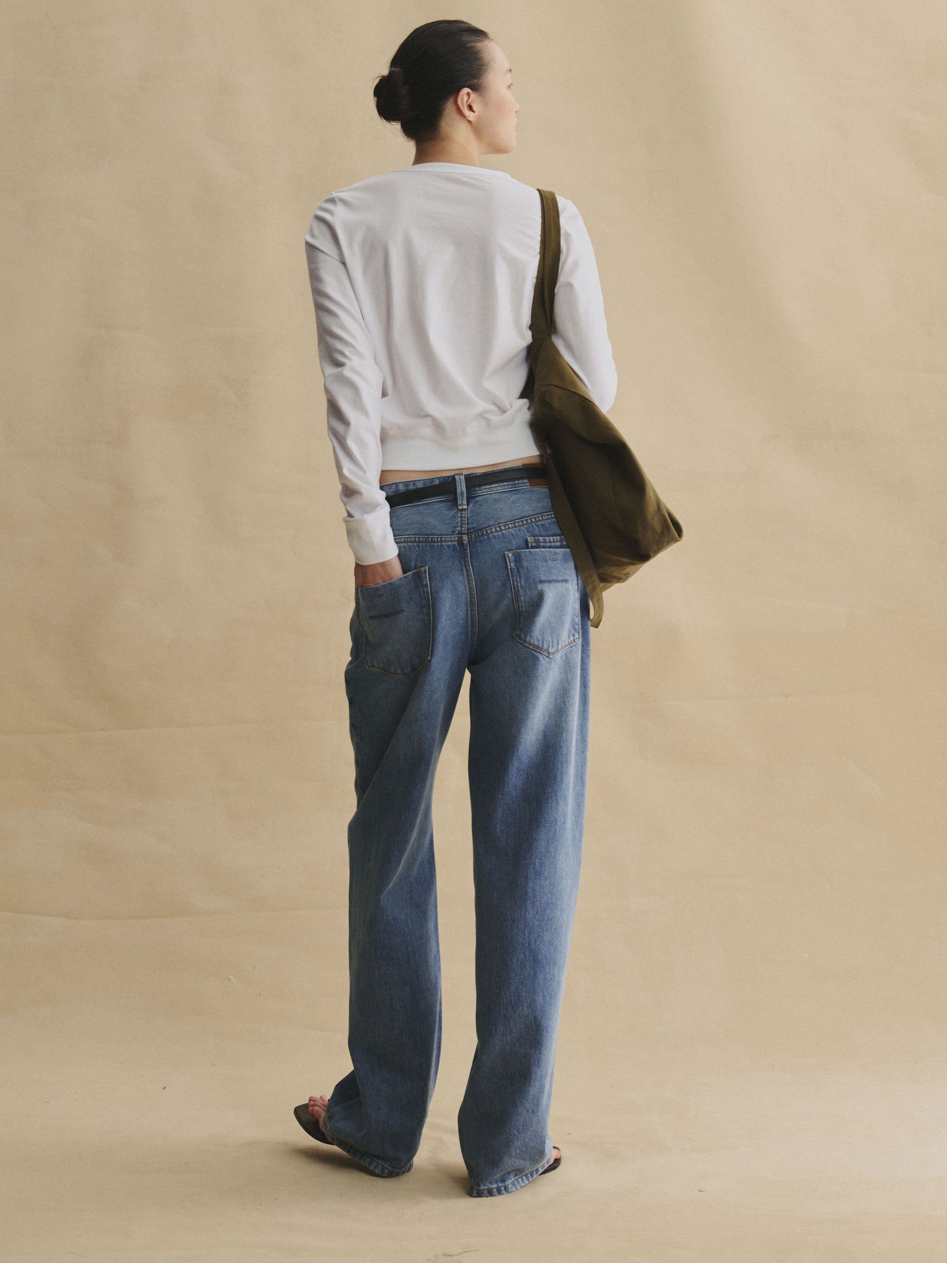 Designed with a relaxed mid-rise and a straight, floor-length leg, the cut elongates the frame while allowing comfortable movement through the waist and hips. Finished with a custom full-grain leather back patch, the jeans pair easily with both casual and refined pieces, adapting seamlessly to daily wear, work, or off-duty styling.