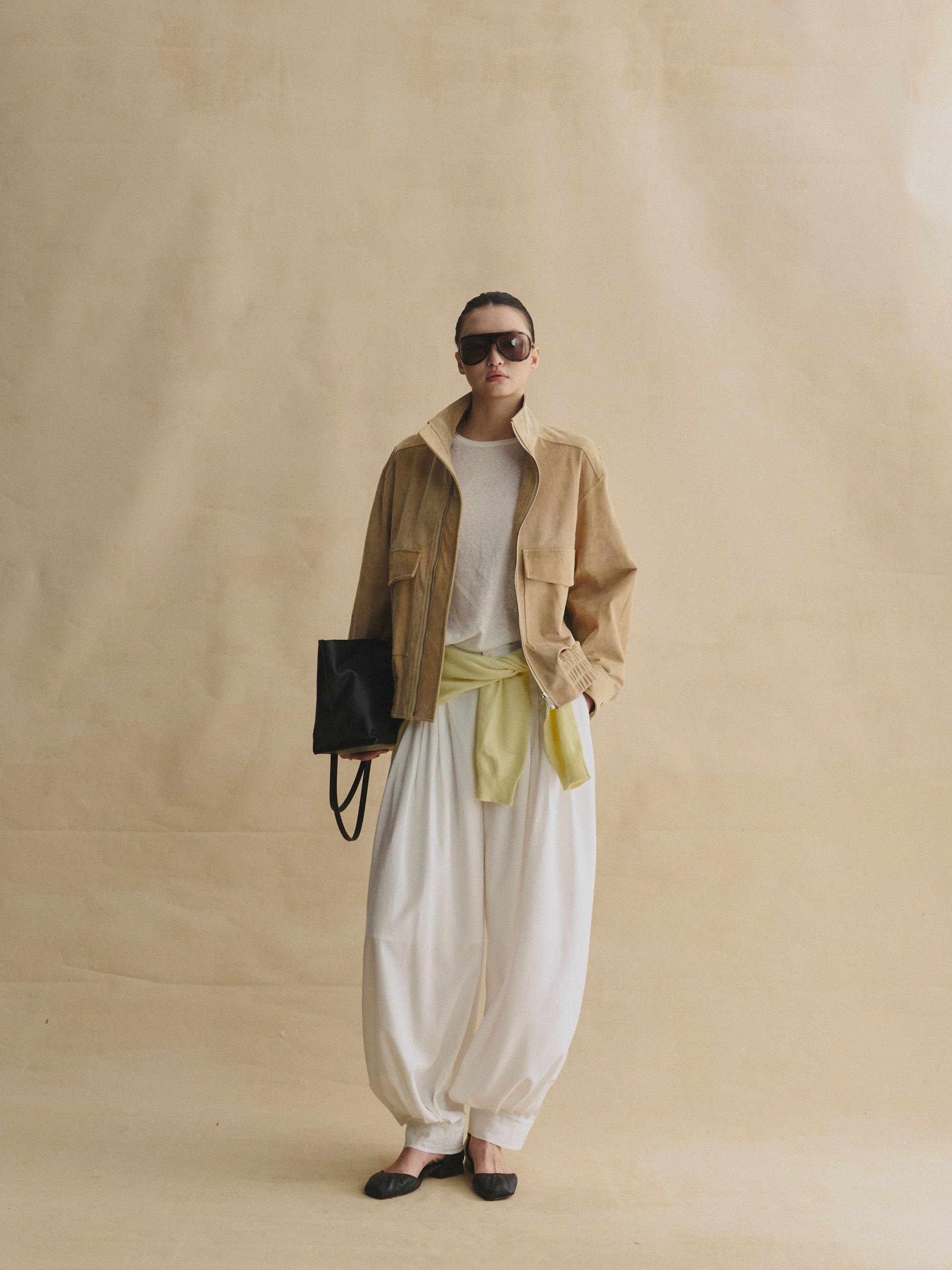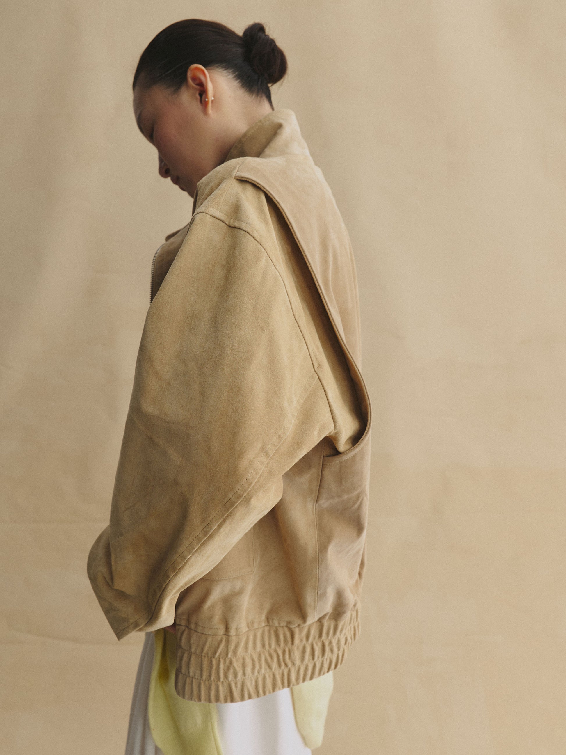 Crafted from premium pig suede leather, this jacket balances structure with softness for an effortlessly refined look. The silhouette draws inspiration from classic heritage outerwear, combining relaxed proportions with a clean, controlled finish. The collar is designed to be worn open or standing, offering versatile styling while elongating the neckline. Large patch pockets add both function and a subtle utilitarian edge. A timeless leather jacket that moves seamlessly between urban wear and understated vintage style.