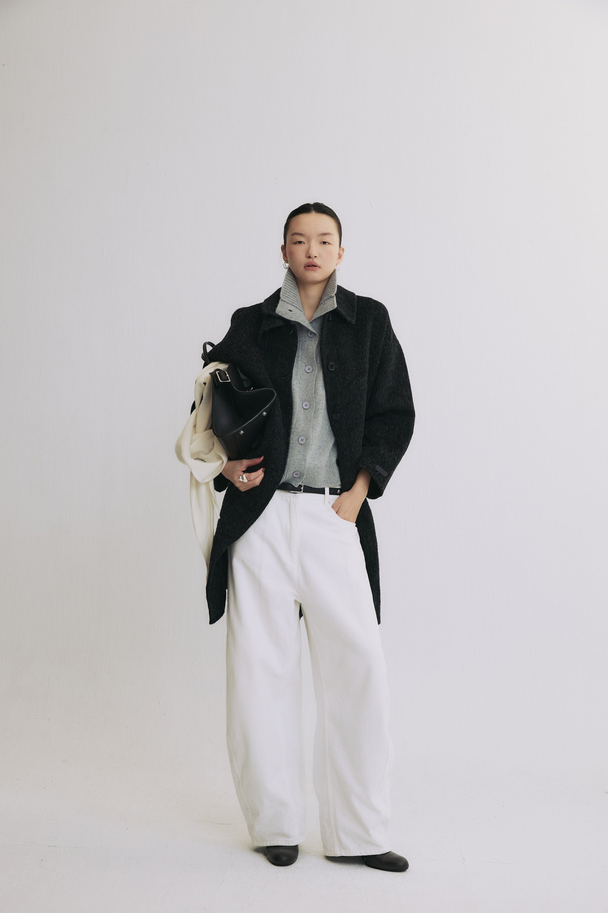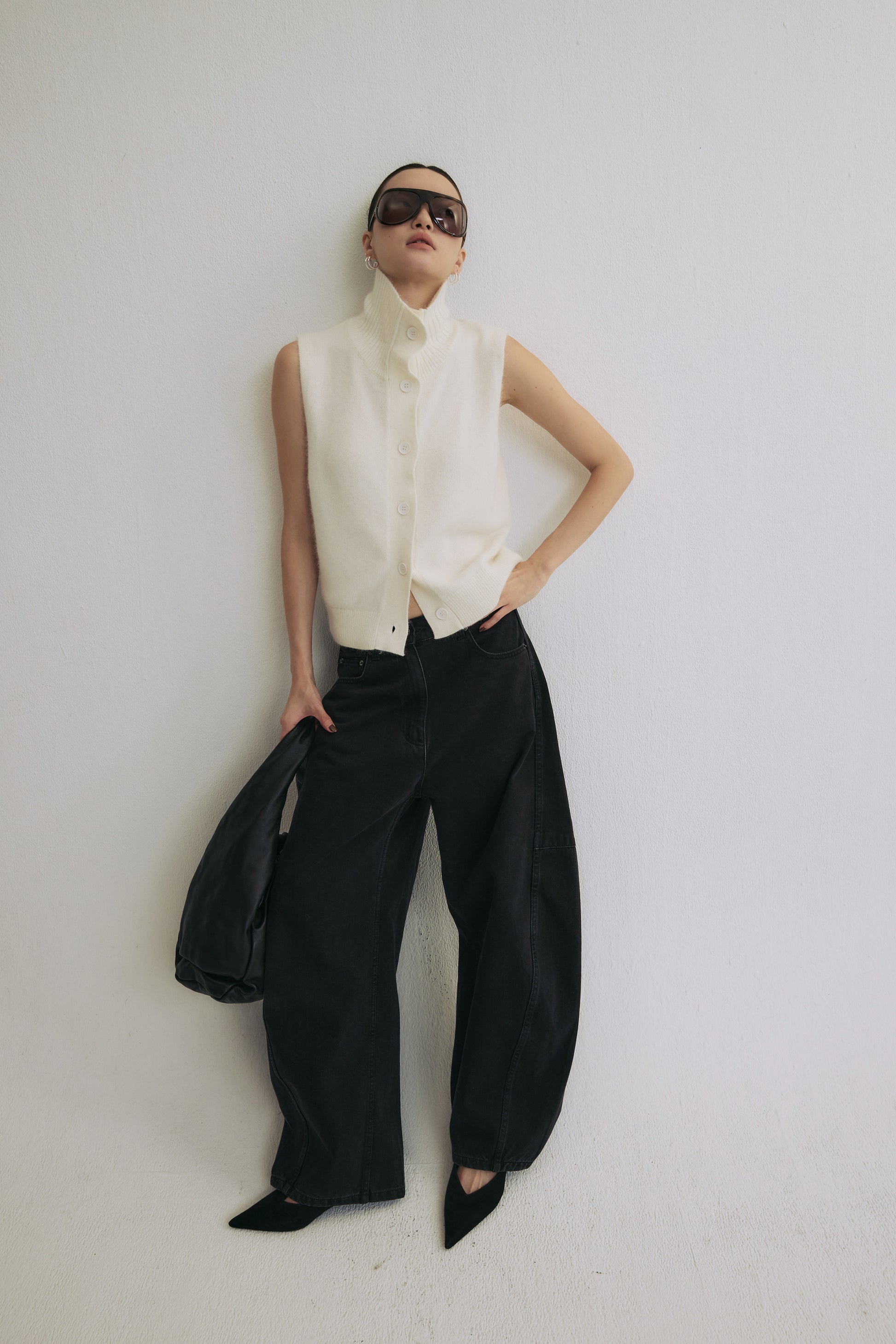 The high neckline and sleeveless cut create a refined silhouette that bridges vintage charm with modern simplicity. Straight, relaxed tailoring streamlines the body without constraint, while the open-front button placket allows versatile layering. Subtle details elevate this minimalist piece, making it a sophisticated essential for transitional dressing.