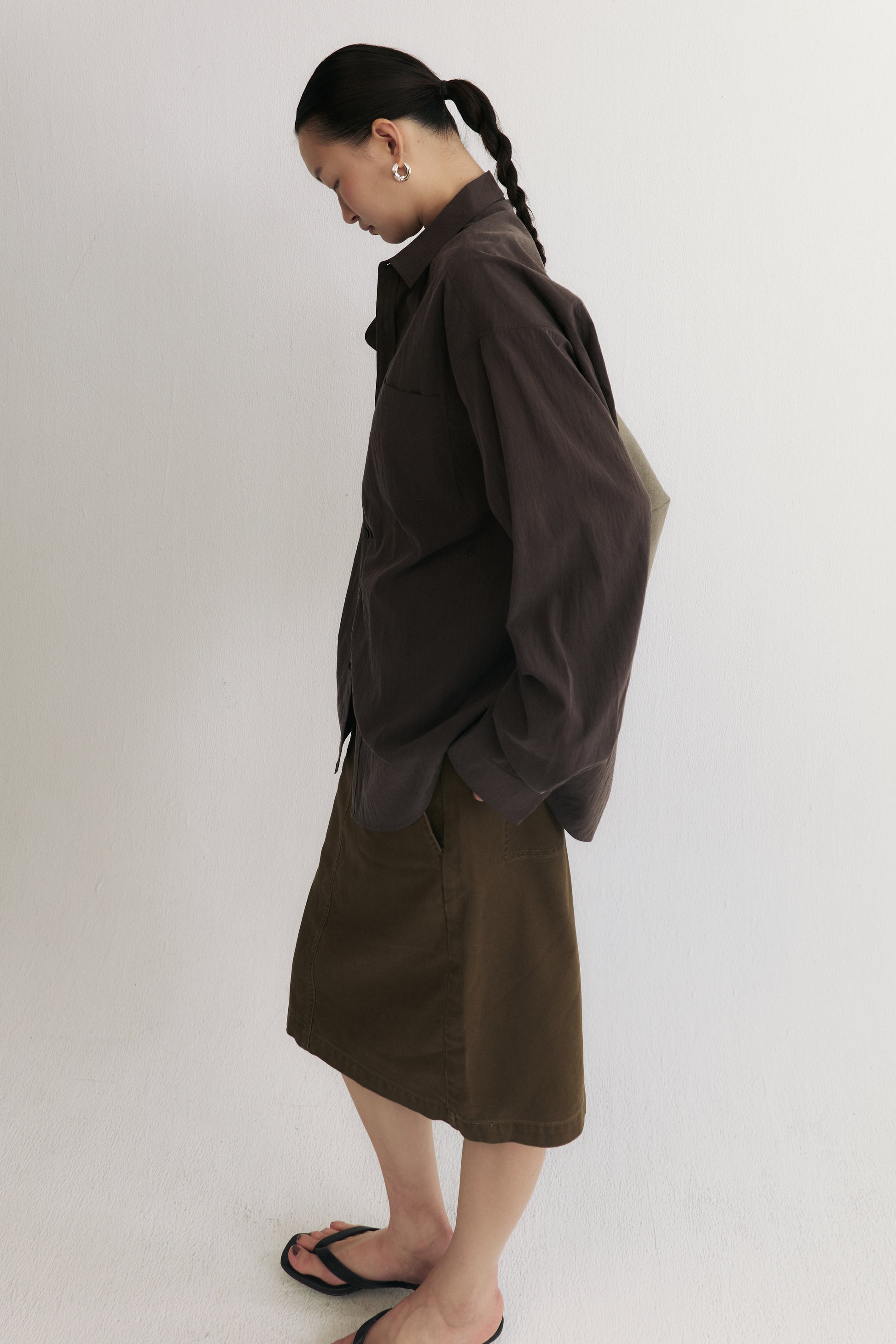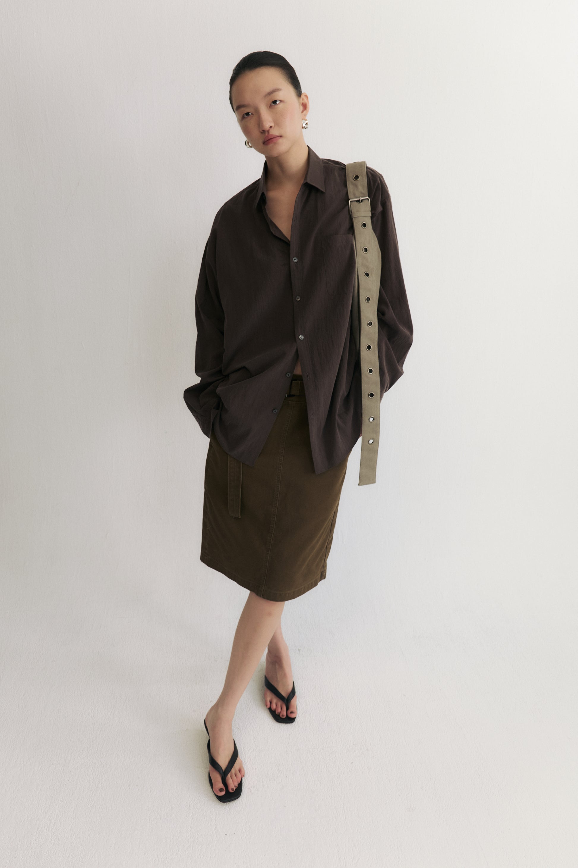 90s 復古腰帶工裝半裙將工裝元素的實用性與柔和的女性氣質結合,寬鬆微H版型在不受束縛的同時修飾身形比例,適合多種體型穿著。中低腰設計散發隨性氛圍,並在視覺上優化曲線。選用優質親膚磨毛棉斜紋布,布料密實挺括、紋理清晰,手感順滑柔軟,經特別復古水洗工藝處理,色澤更具層次與耐看度。自布腰帶兼具實用與造型感,搭配洗舊質感,呈現歷久彌新的復古韻味,輕鬆適配休閒或略為正式的造型。
