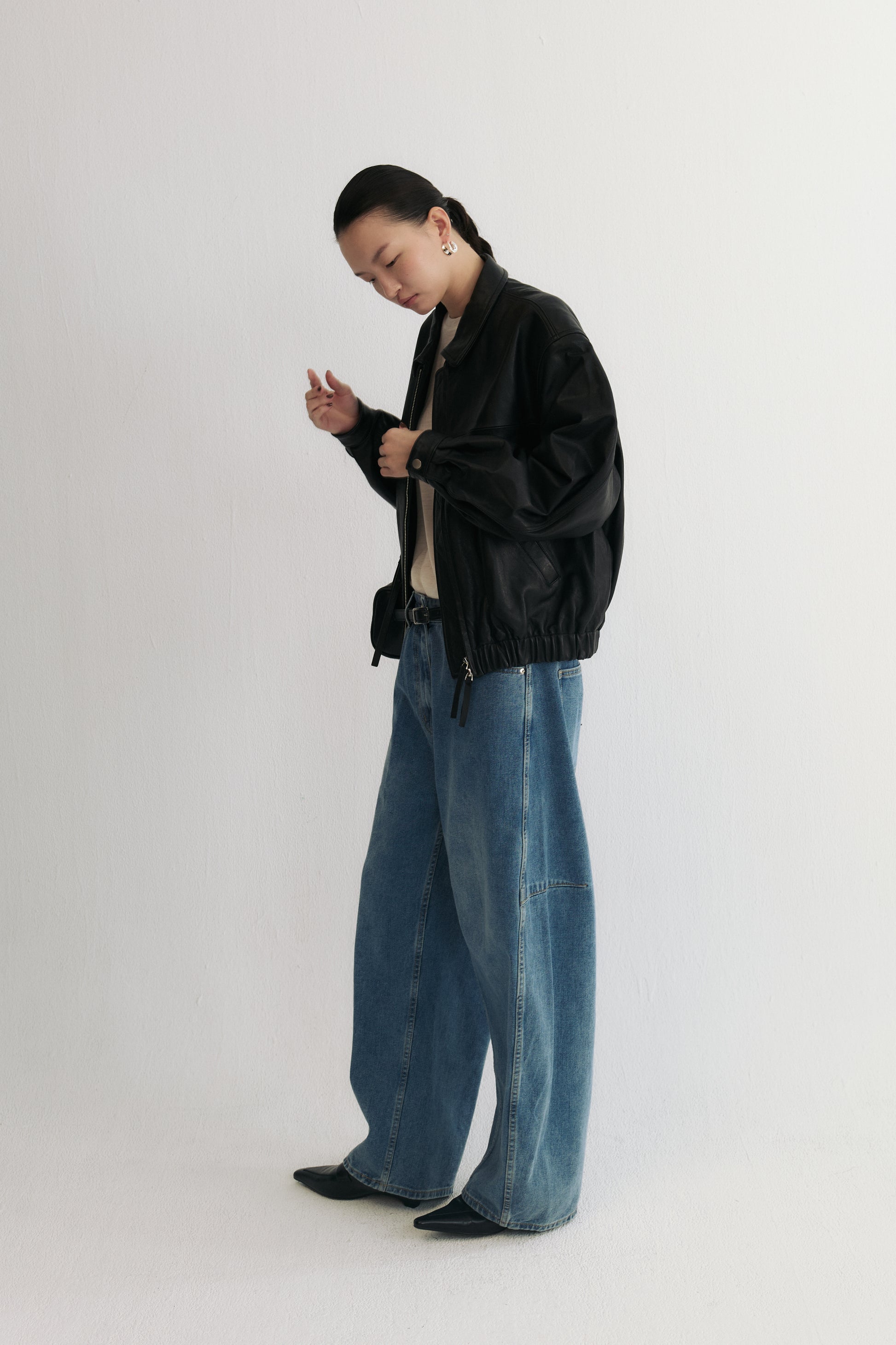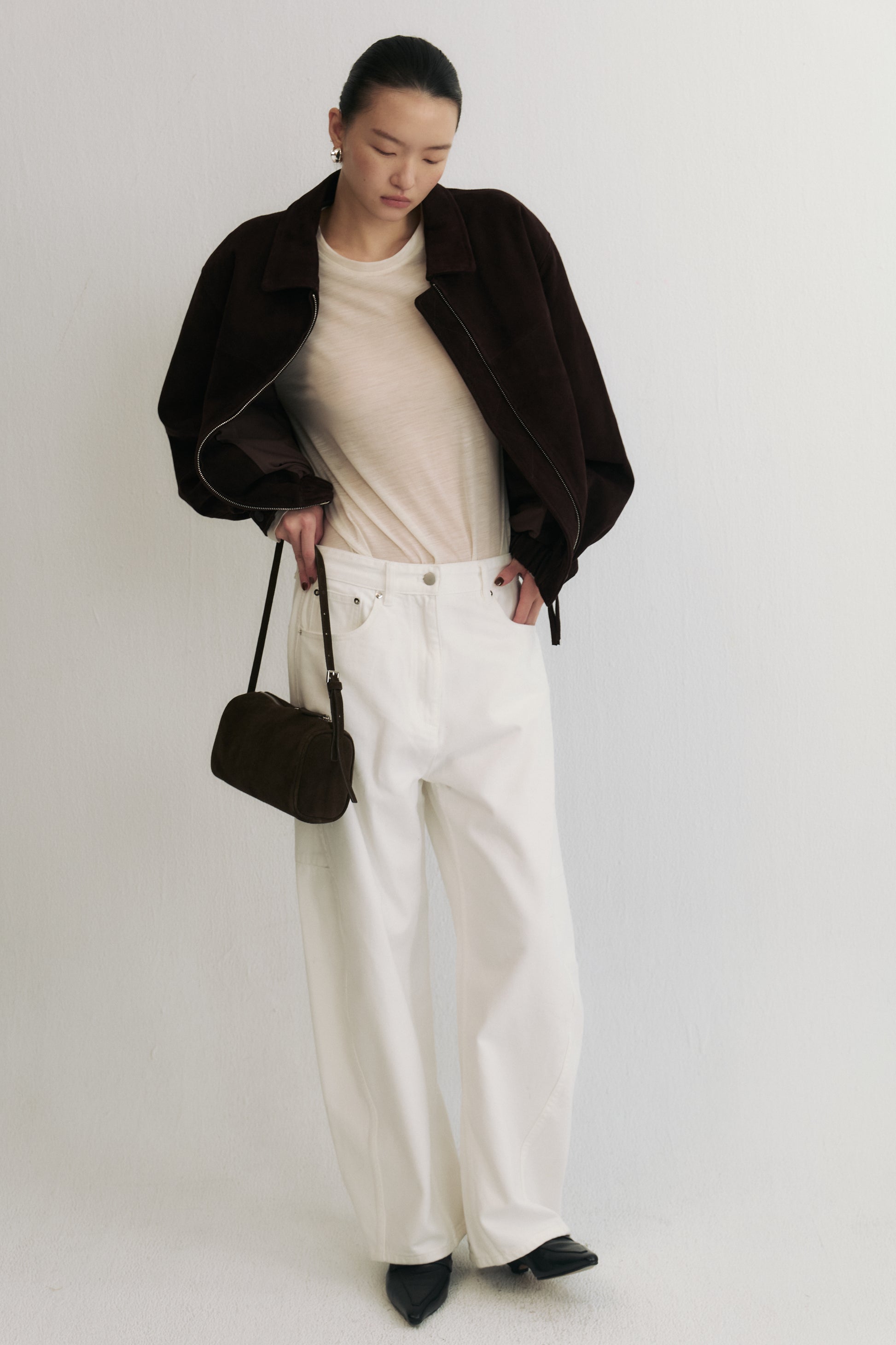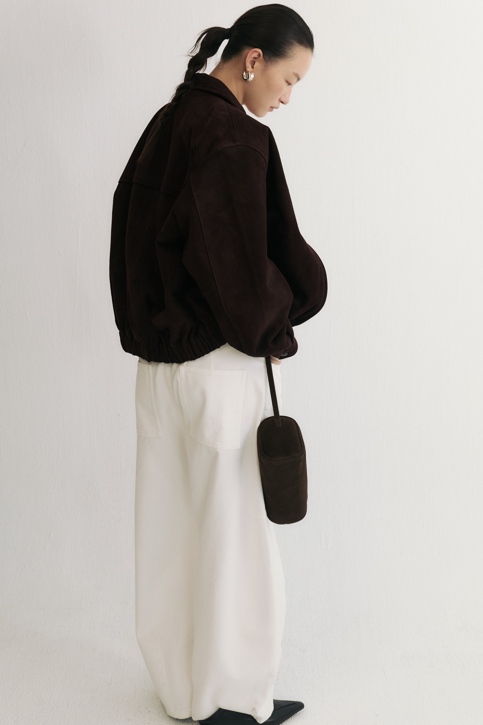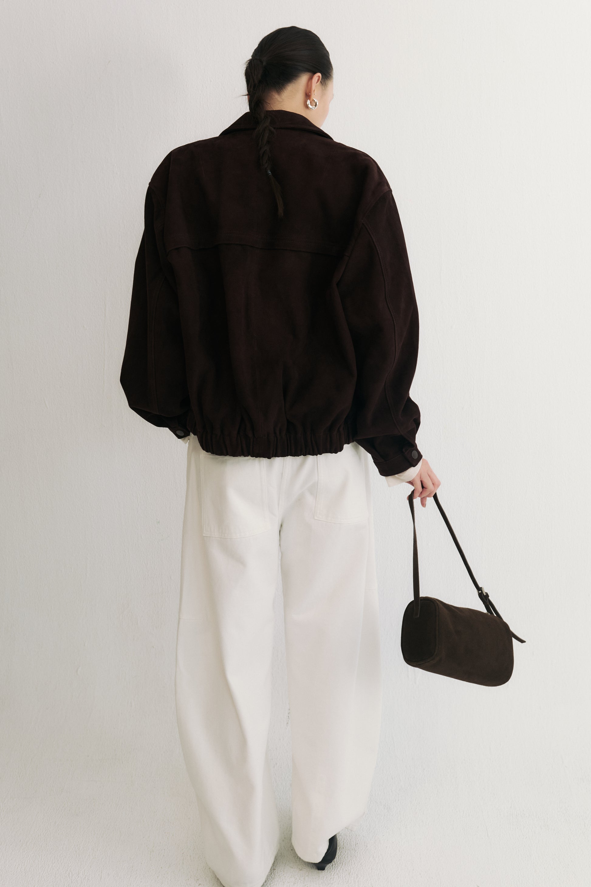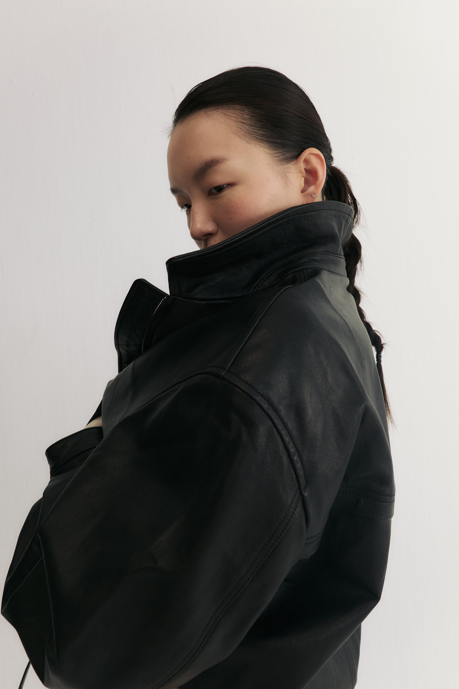 柏林往事綿羊皮翻領皮衣夾克,以立體有型的版型結合高定級打版工藝,打造出既挺拔又貼合身形的舒適剪裁。小巧的復古翻領為整體增添俐落與個性,微微落肩的設計令線條更顯順暢與隨性。嚴選進口綿羊皮,經典消光黑色款觸感柔軟細膩、保有自然皮紋與良好透氣性,垂墜自然不顯僵硬;巧克力麂皮款則採用頭層綿羊皮經刷毛處理,呈現細緻啞光絨感與低調的方向性紋理,流露復古老錢風韻味。搭配定製順滑拉鍊與同色系皮革拉片、內擋風片及精緻壓線工藝,兼顧美觀與實用。鬆緊下擺設計使整體線條收束俐落,同時增添防風與保暖效果。