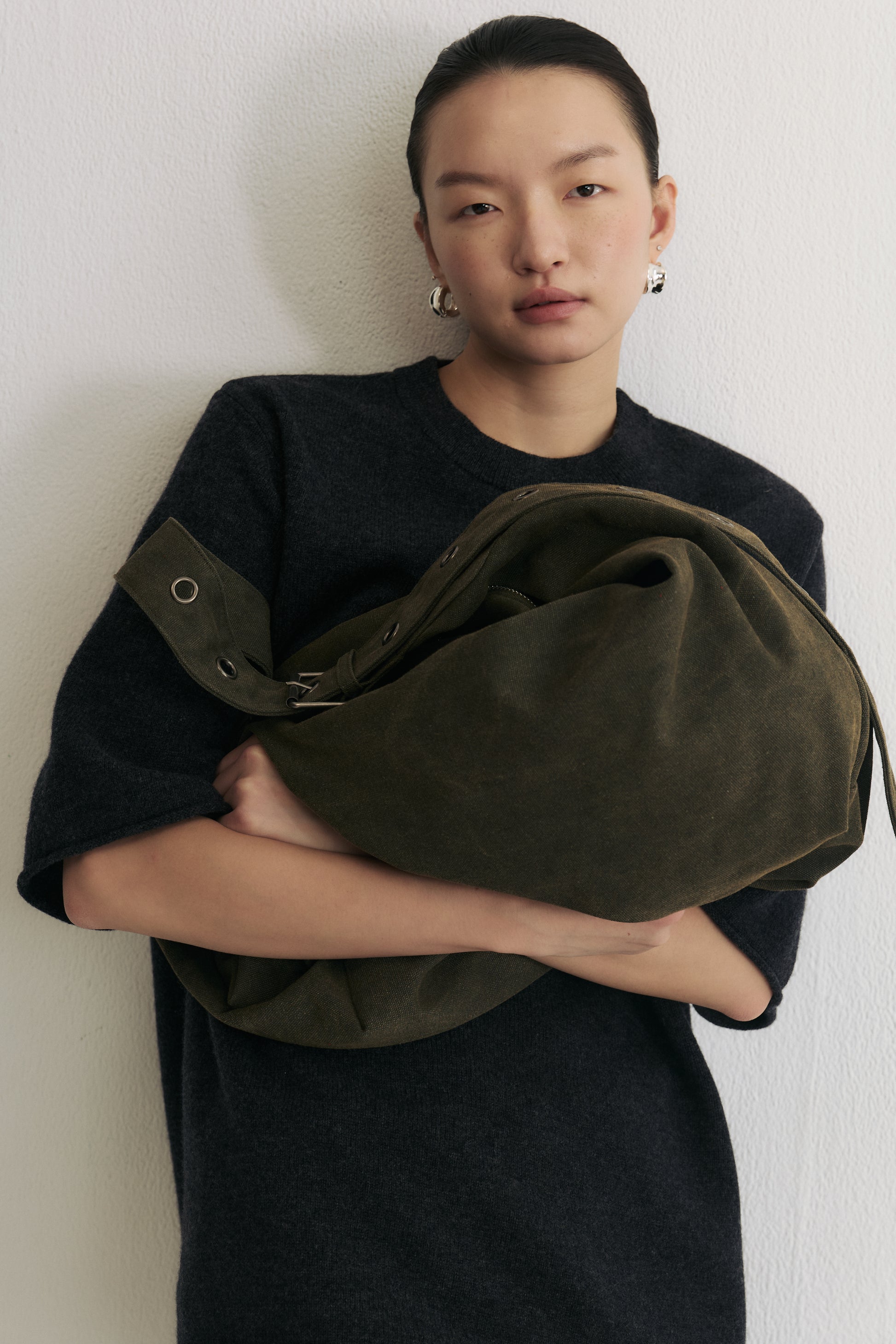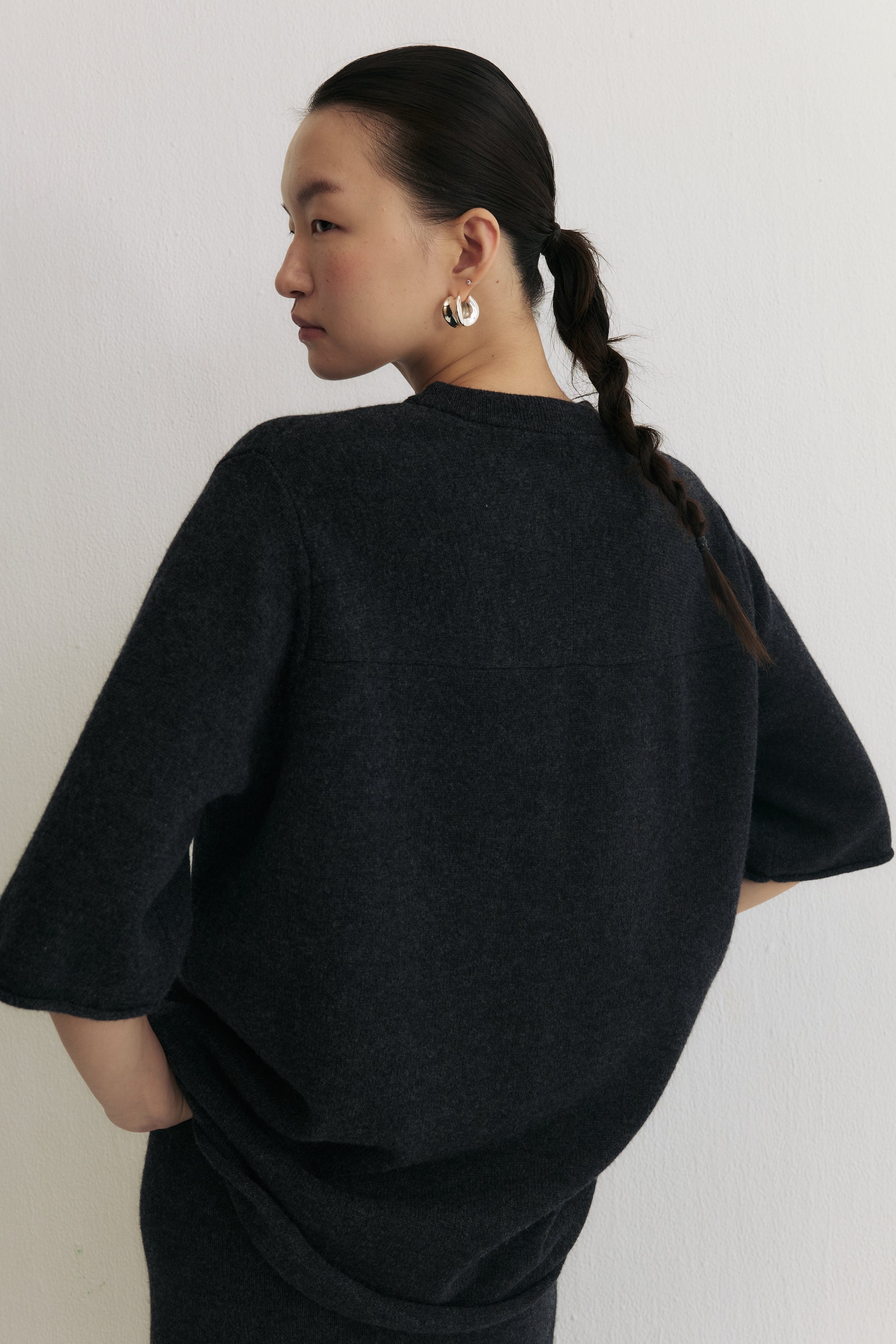 上衣: 採用極簡落肩設計,寬鬆箱型版型,前短後長比例修飾身形。經典圓領與精心調整的肩袖比例,穿著不受拘束,單穿或疊搭皆能展現從容氣質。