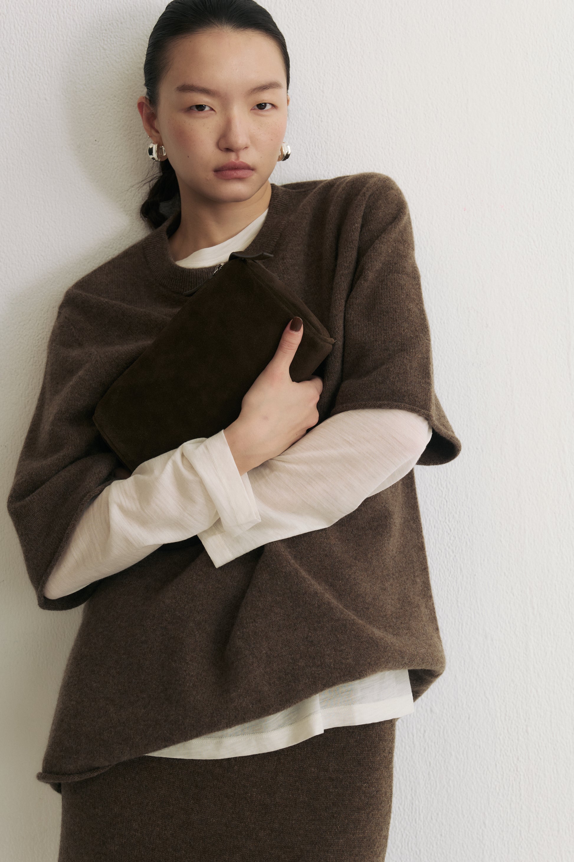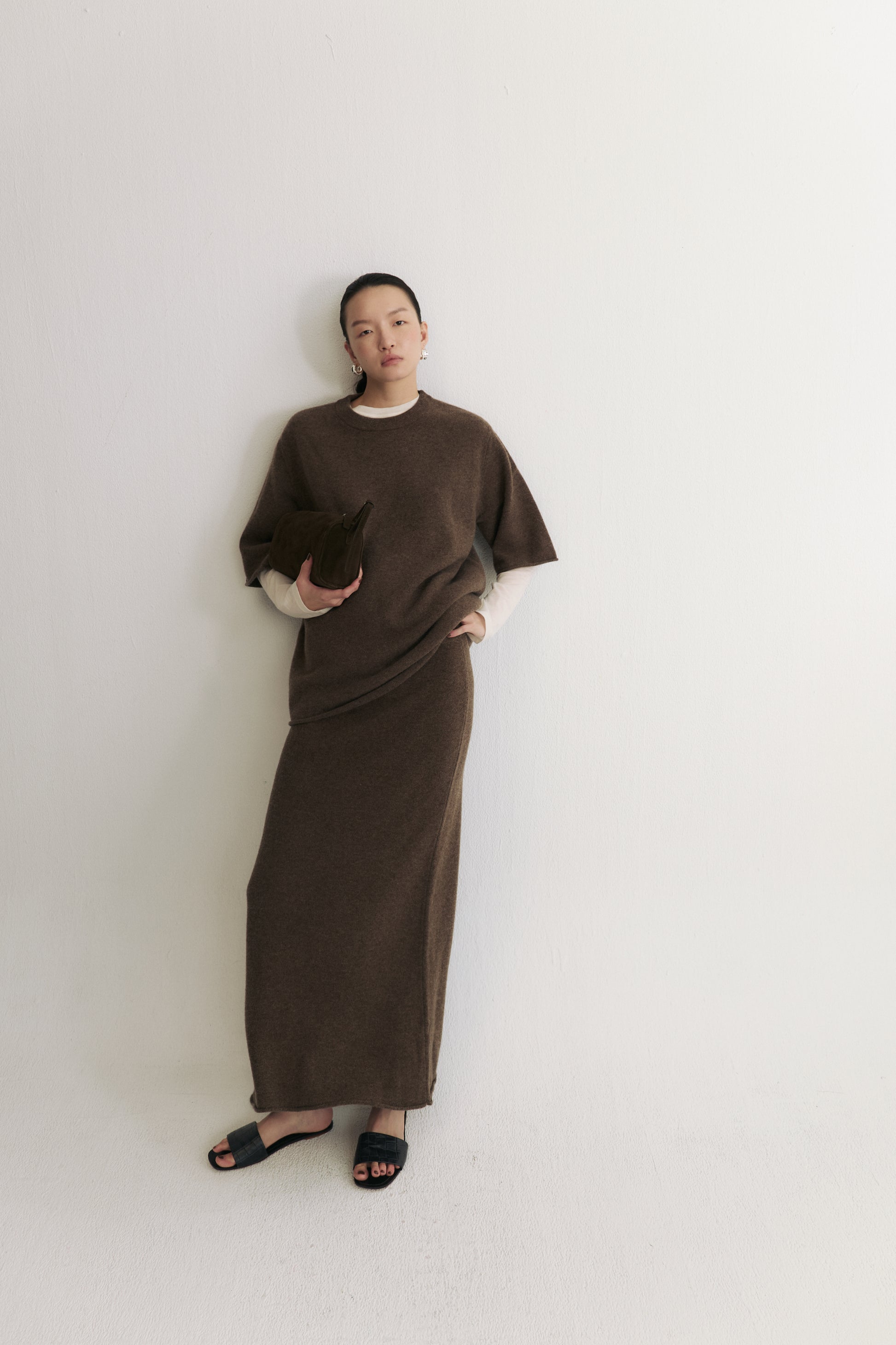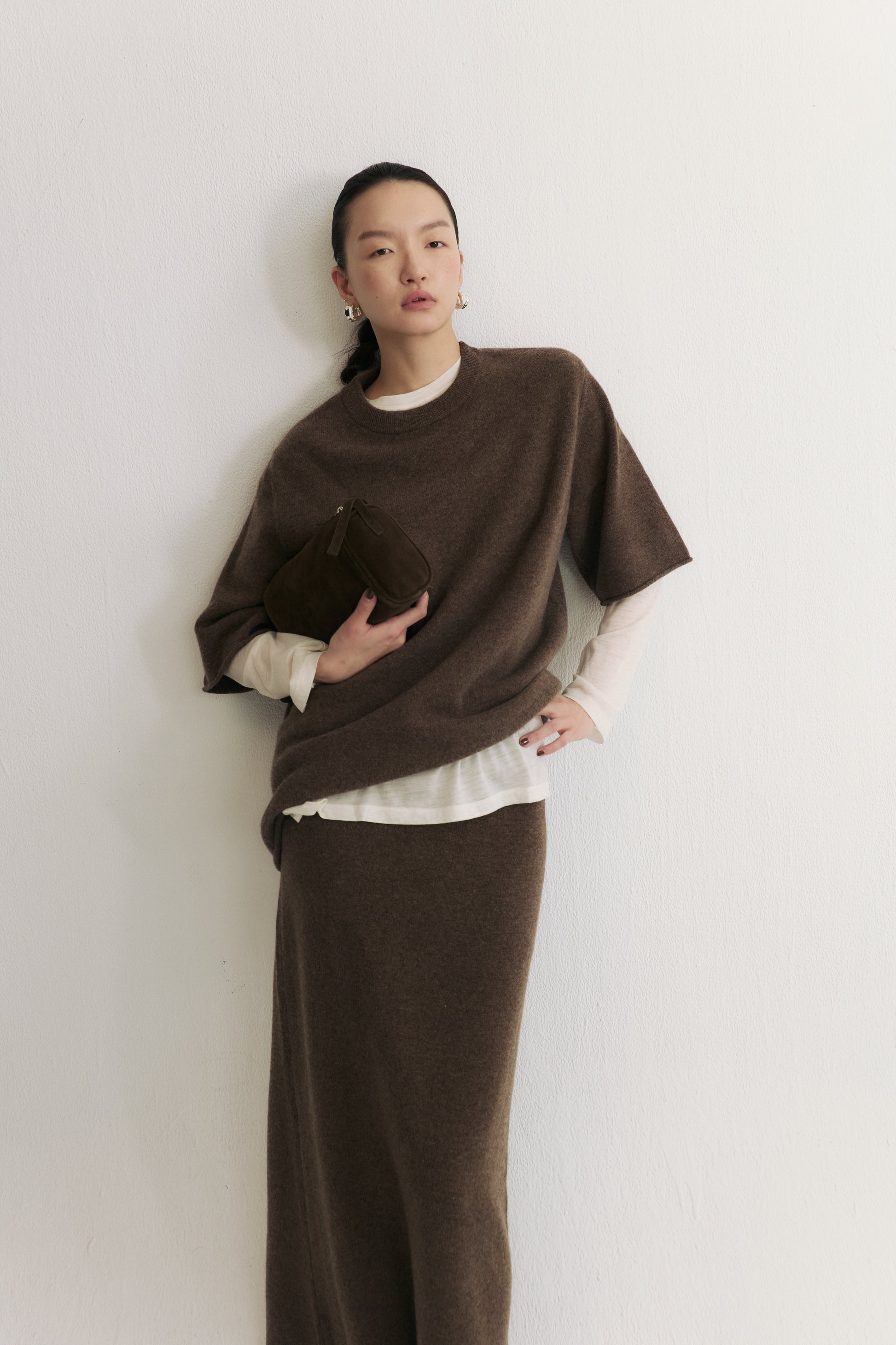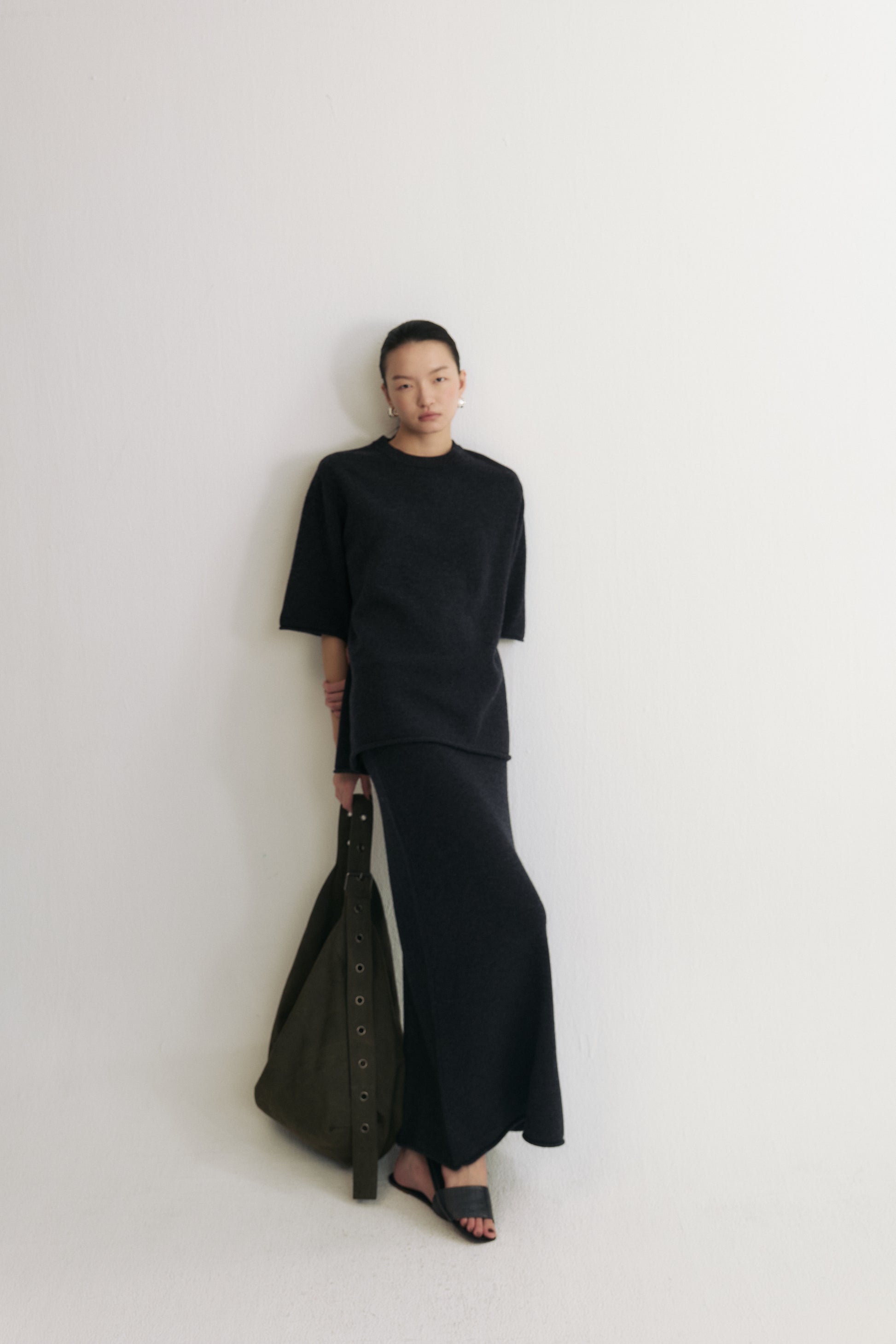 半裙: H 型直筒針織半裙,修飾腿型並優化比例。寬邊鬆緊腰頭貼合不同身形,微 A 下擺在行走間保有自在感。與上衣成套穿著,演繹慵懶與精緻並存的冬日氛圍。
