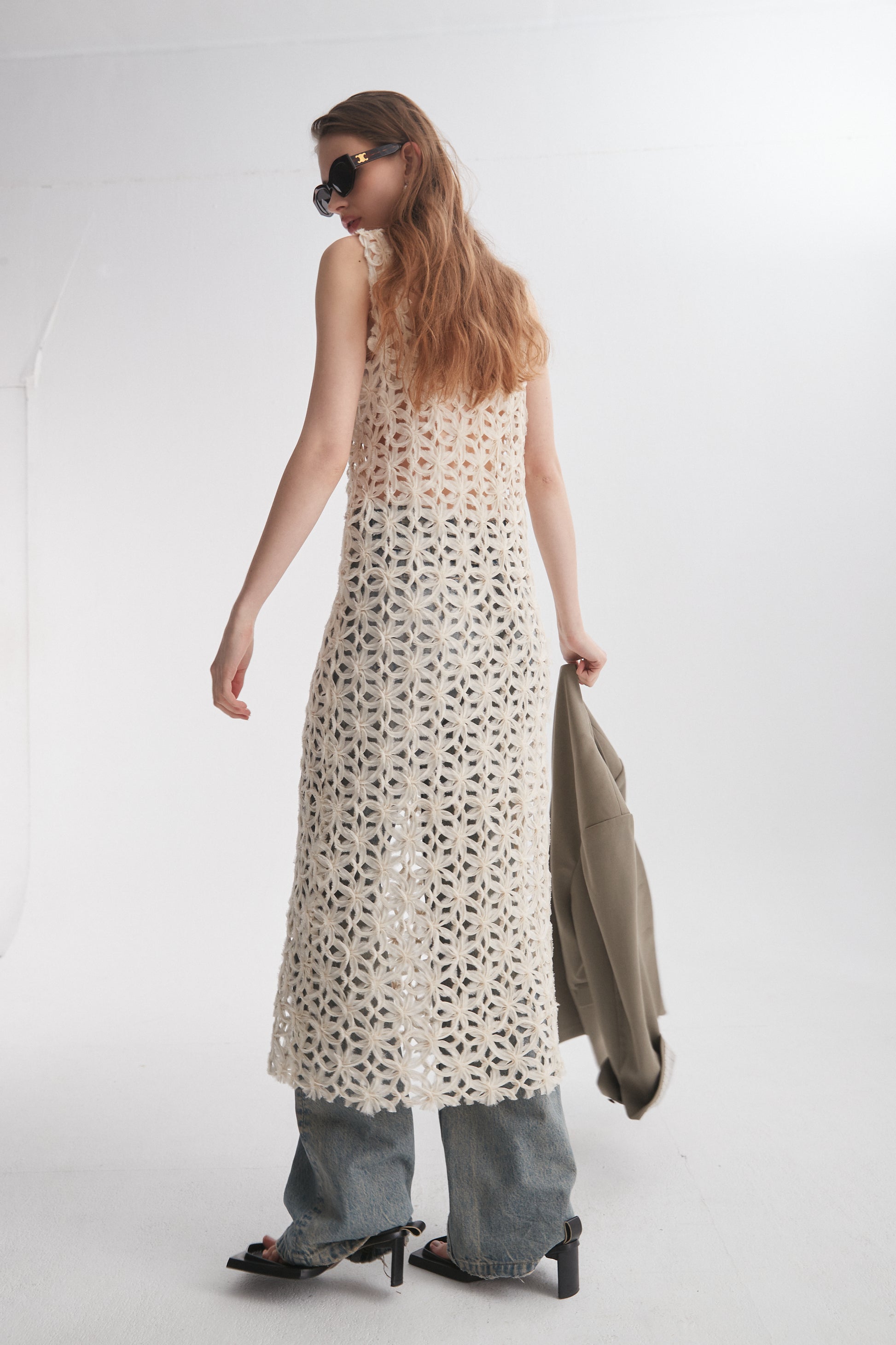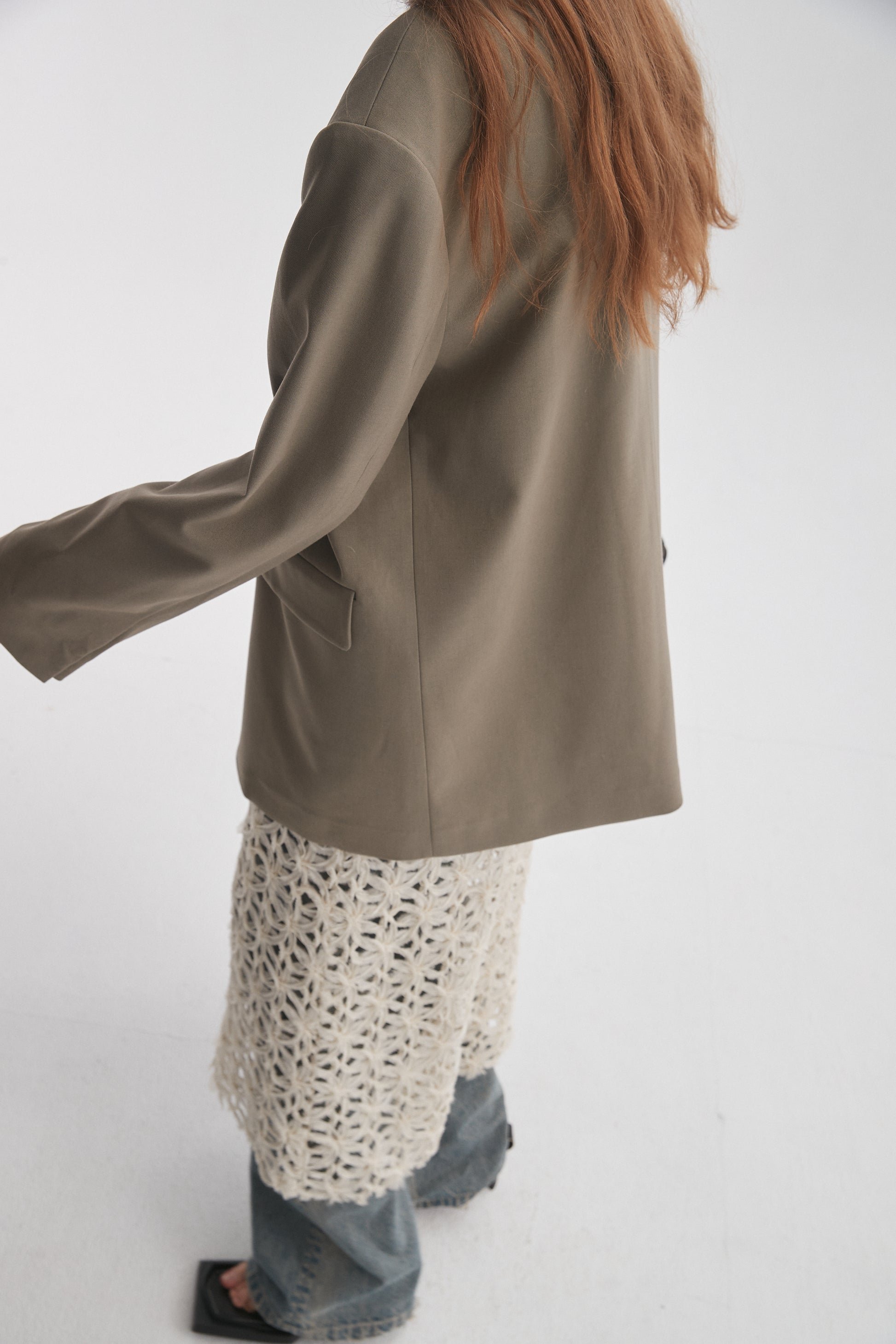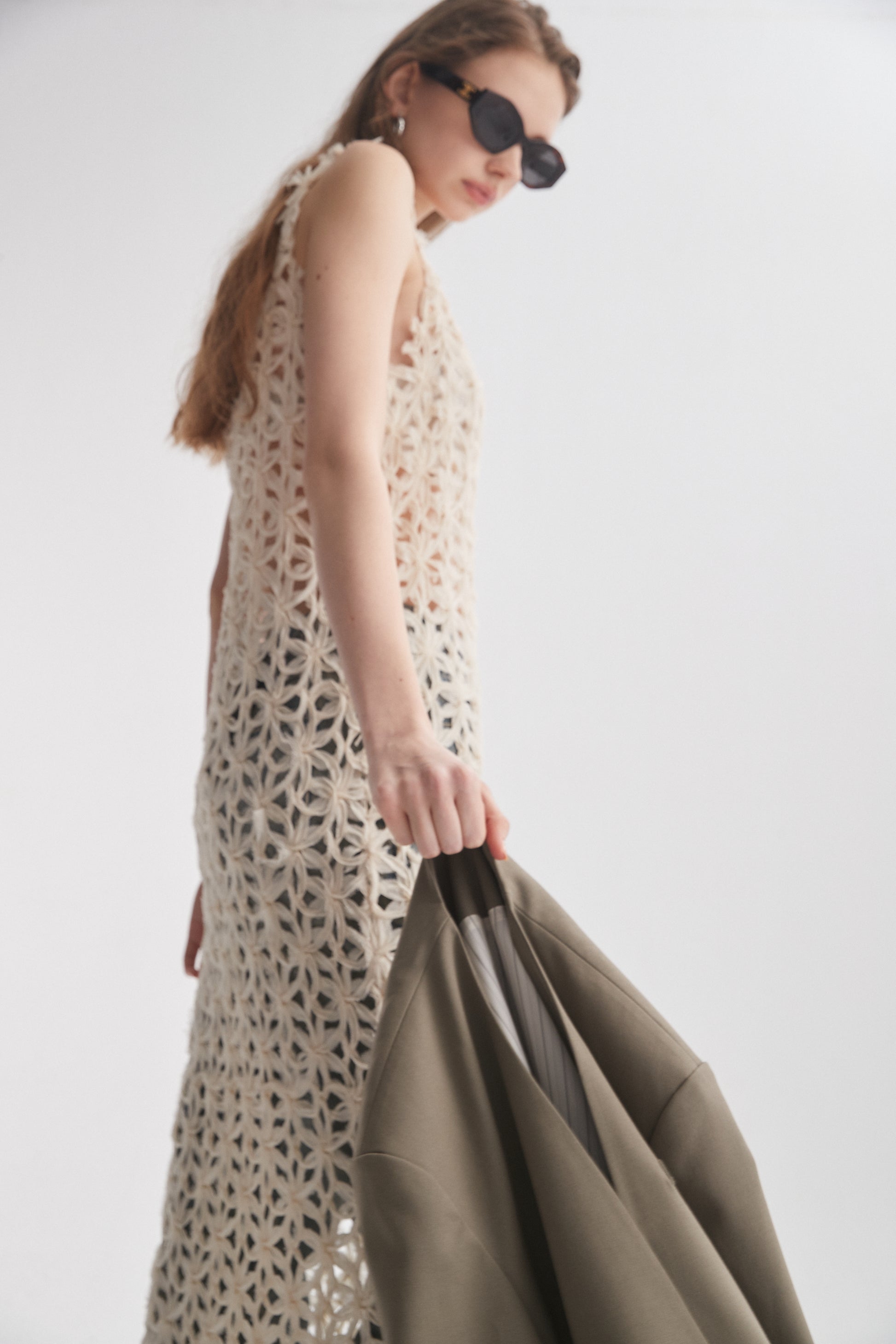 SLO 相信穿搭應該既有實用性也要有一定趣味性。這件單品使用豐富細緻的立體鏤空面料,廓型剪裁,為您的穿搭增加了一分個性。整體設計融合了優雅與精緻感,花朵鉤針編織疊層營造出 20 世紀 70 年代的夢幻效果。與我們的綠卡其色無領男友風西裝外套和微喇牛仔褲搭配,打造出浪漫別緻的穿搭。