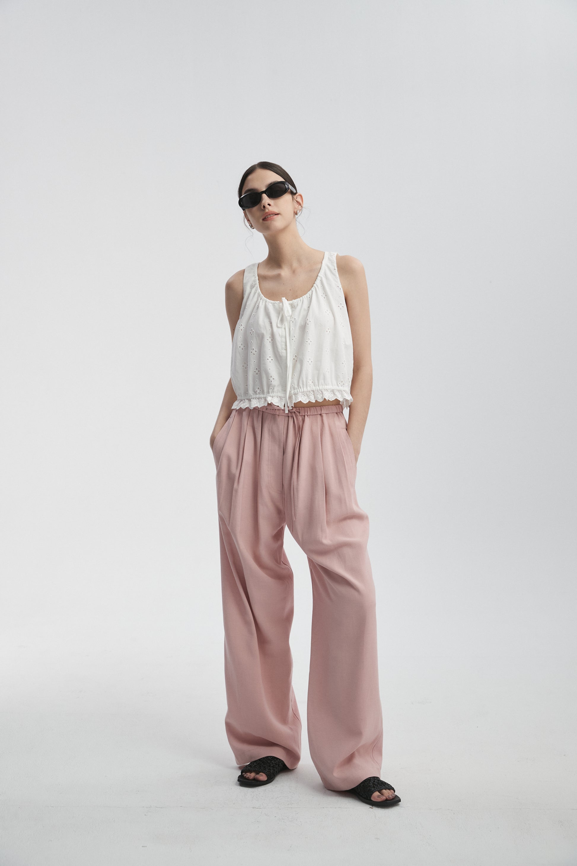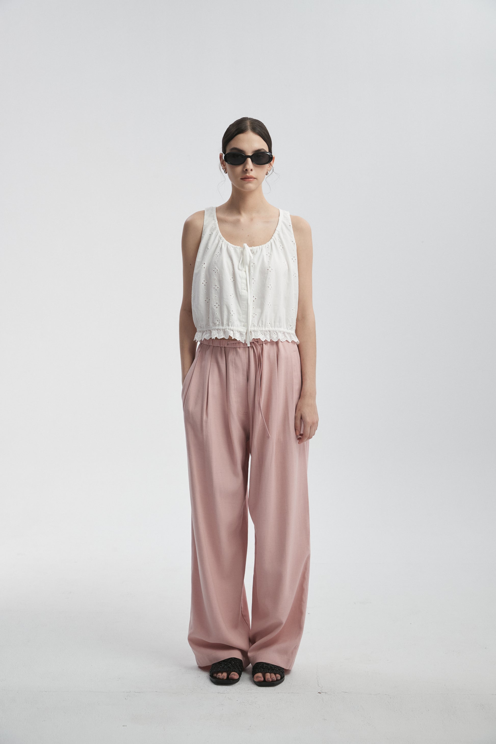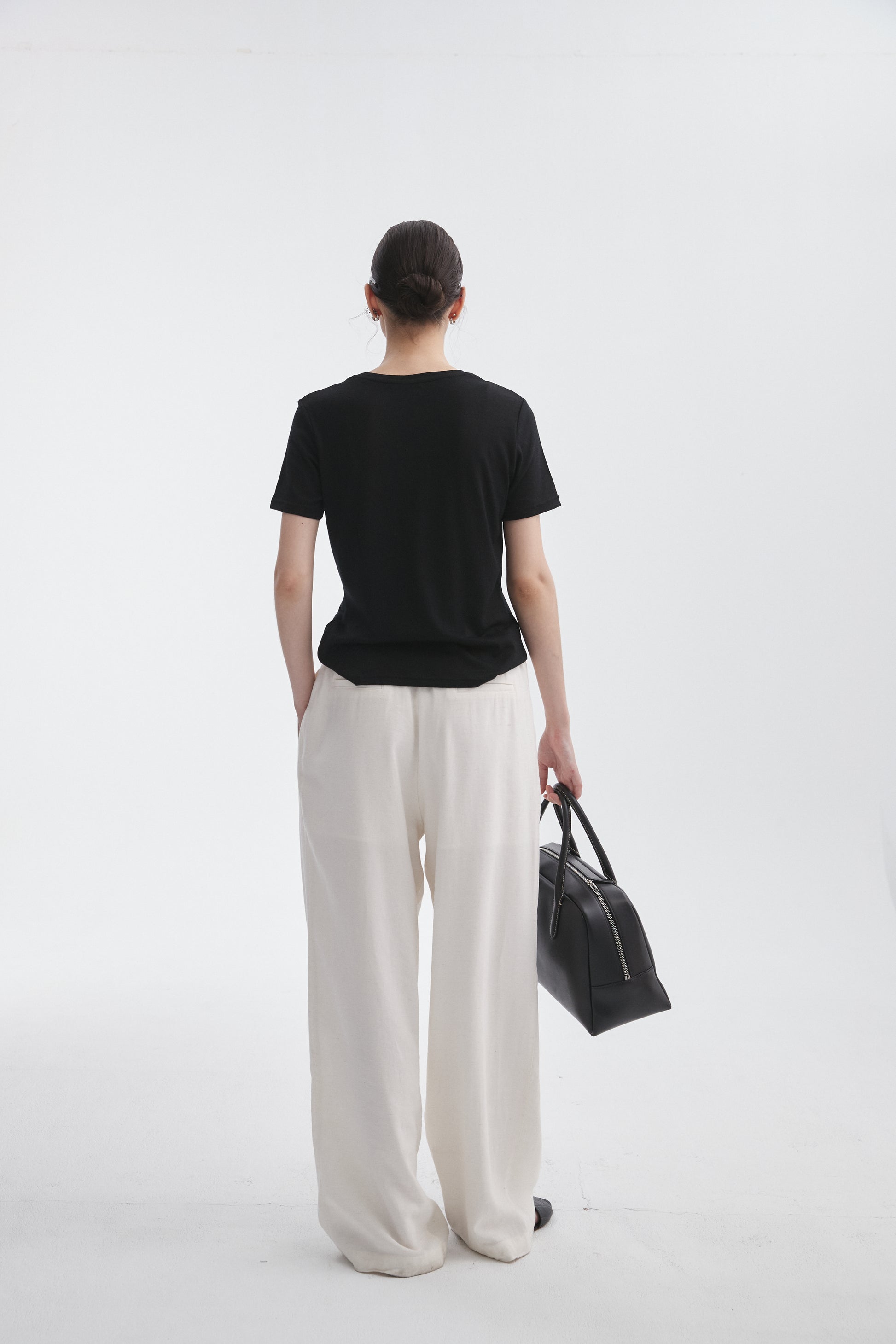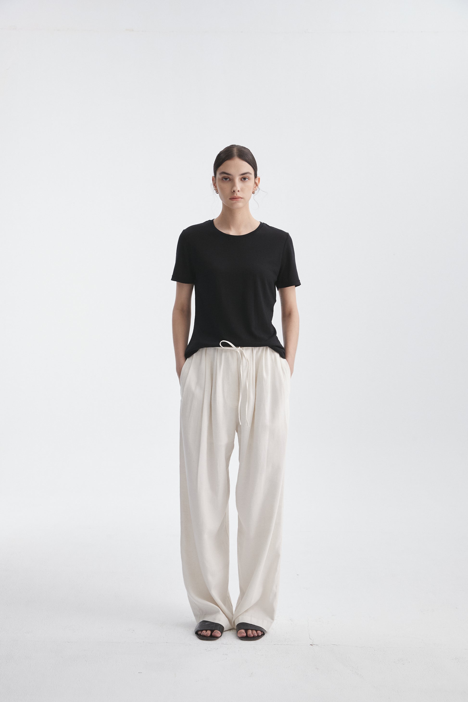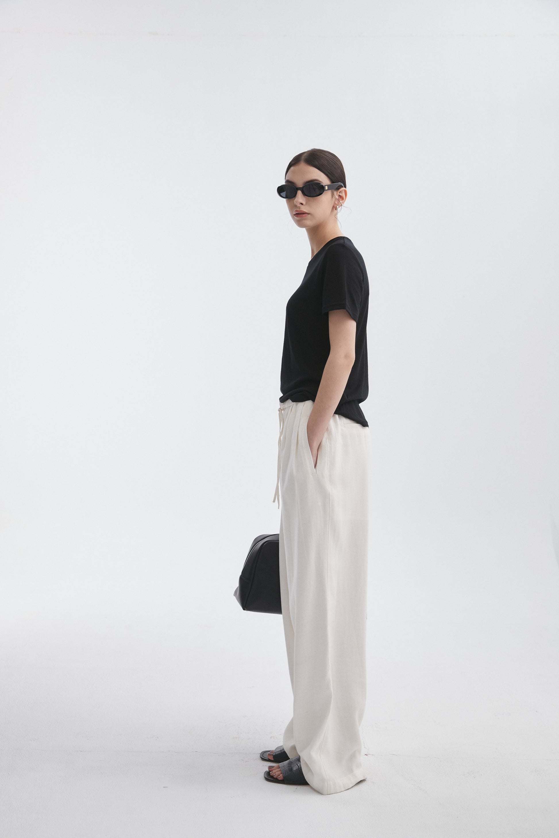 這條褲子採用亞麻混紡面料製成,寬鬆版型和直筒廓形展現出隨性與優雅。帶有抽繩鬆緊的腰部可以確保完美且可客製化的貼合感,同時又增添了休閒感。正面褶皺也增添了細節化的質感,將褲子從基本款提升到精緻款。無論是外出辦事還是休閒在家,都可以輕鬆搭配任何單品