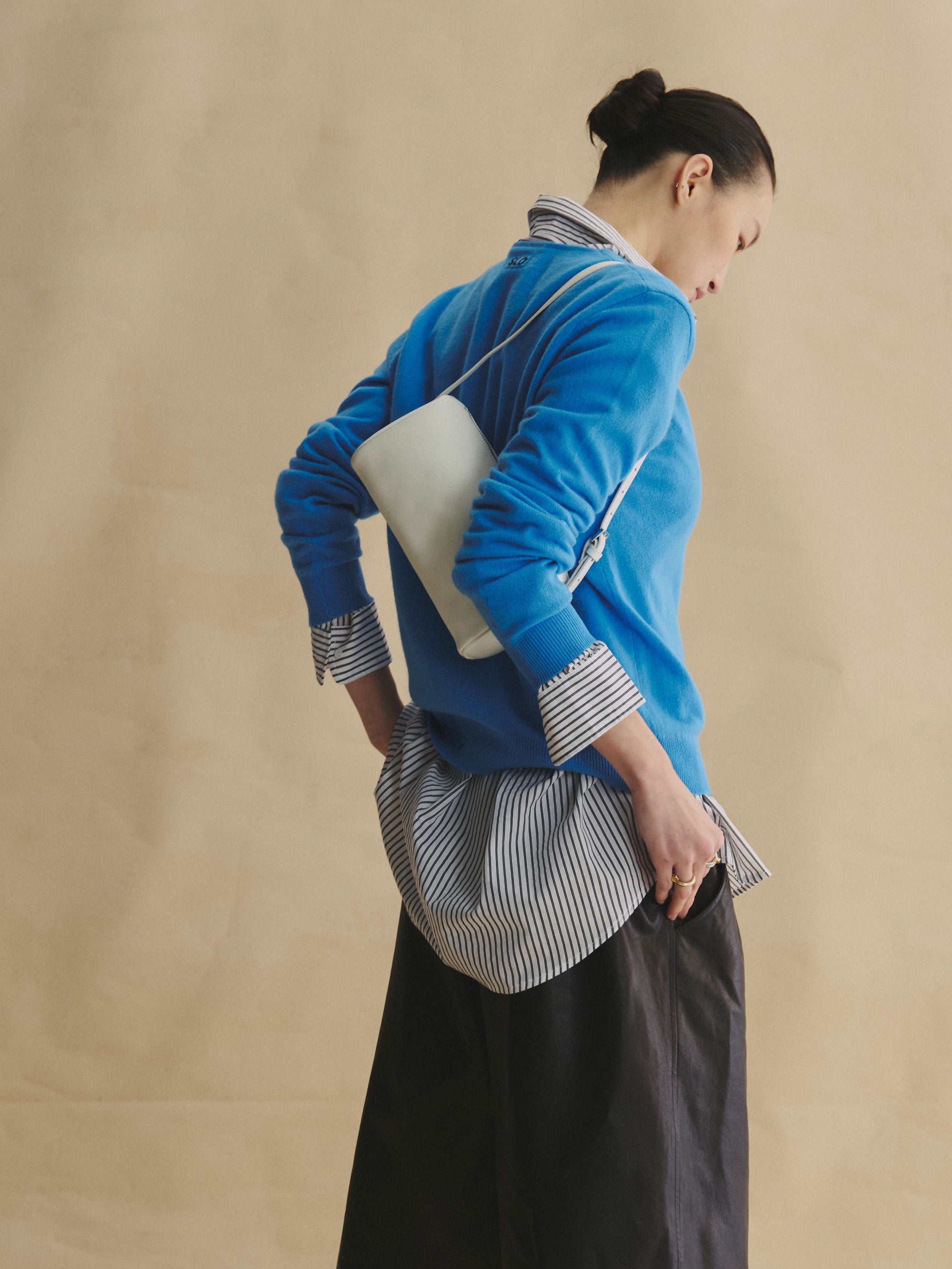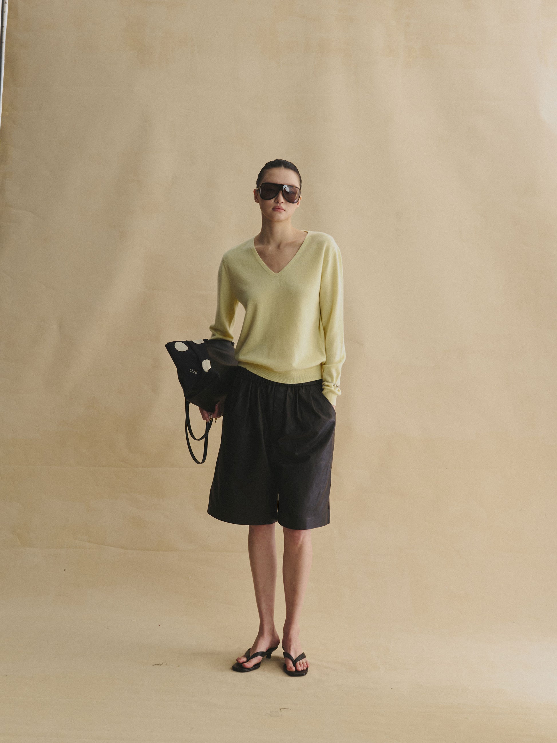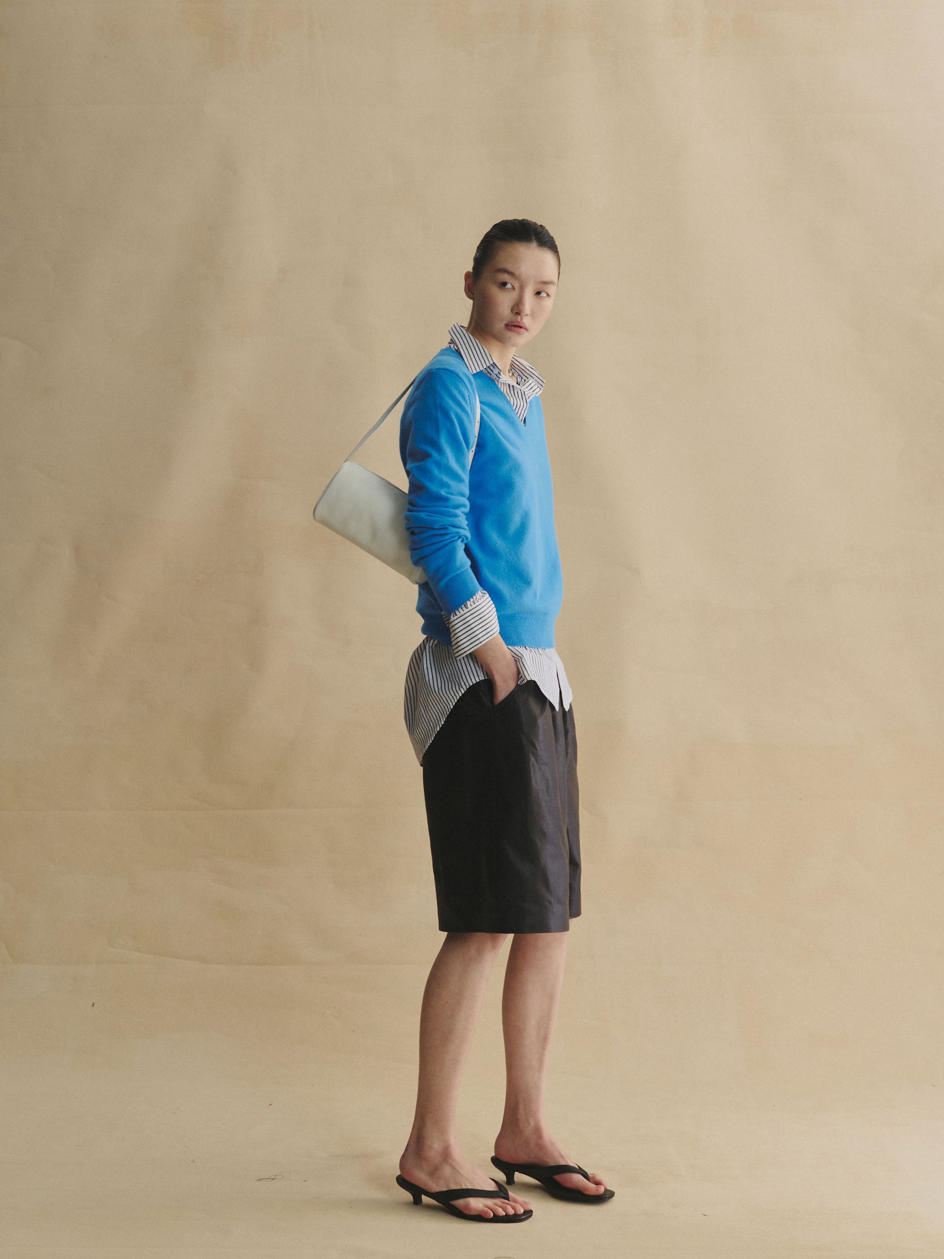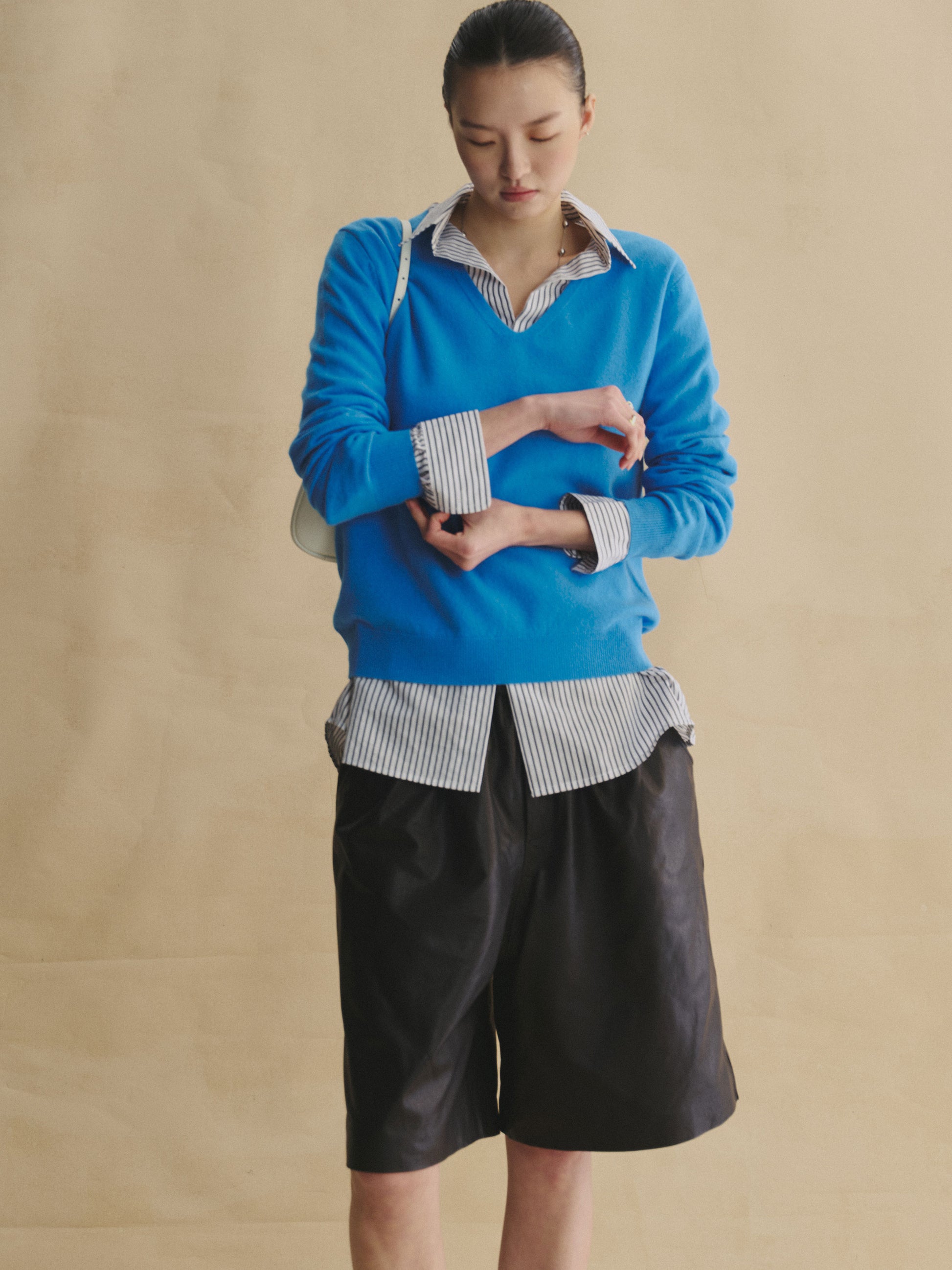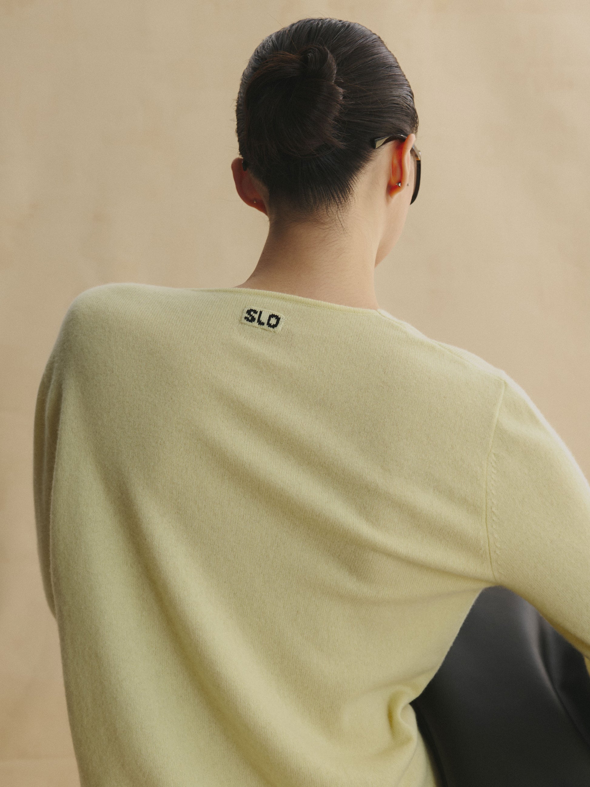 微寬鬆版型自然修飾身形,V 領線條拉長頸部比例,讓整體更顯俐落。極簡結構搭配高辨識度色彩,可單穿也適合疊搭,輕鬆應對多季節穿著需求。後領細緻織入品牌標誌,低調中帶有巧思。