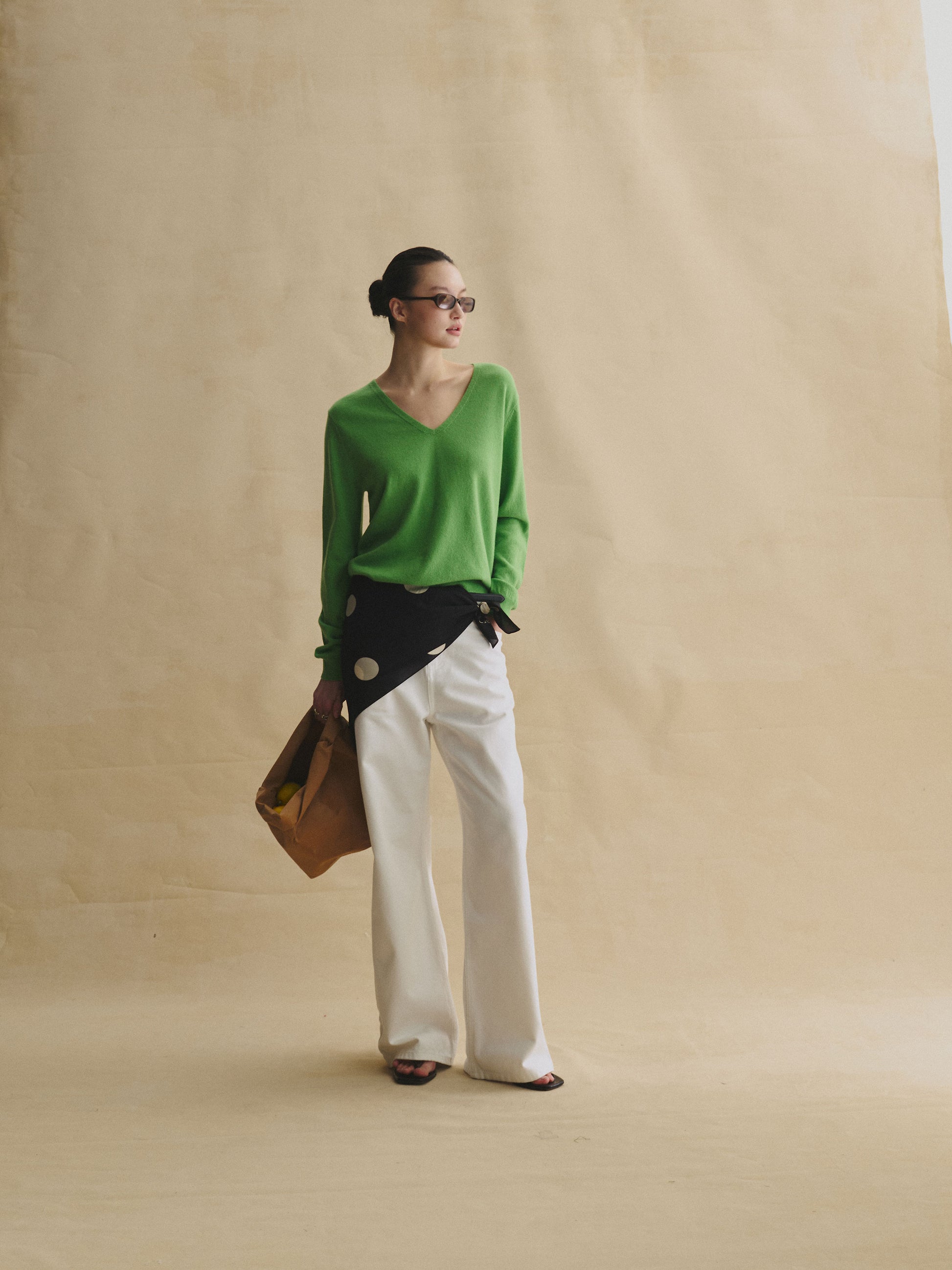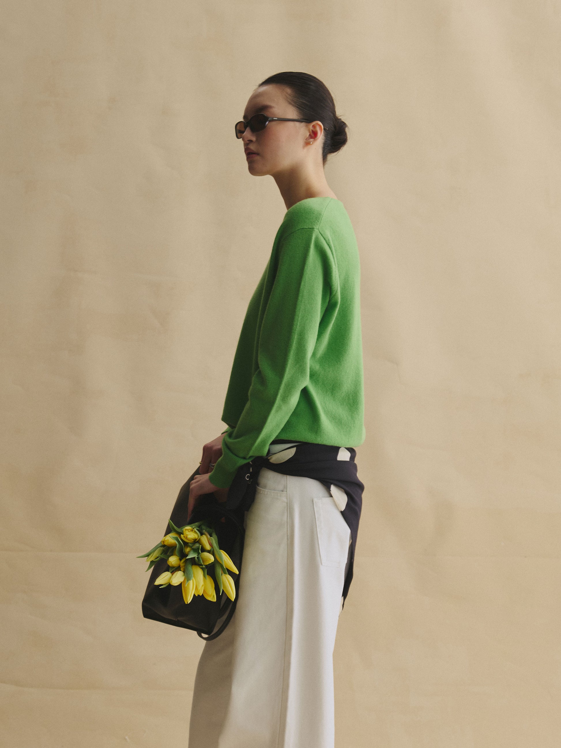 選用 100% 美利奴羊毛定織定染,纖維細緻滑順,親膚透氣,穿著體感乾爽舒適。環保染色工藝呈現純淨柔和的色澤,為日常穿搭注入輕盈而不張揚的亮點。