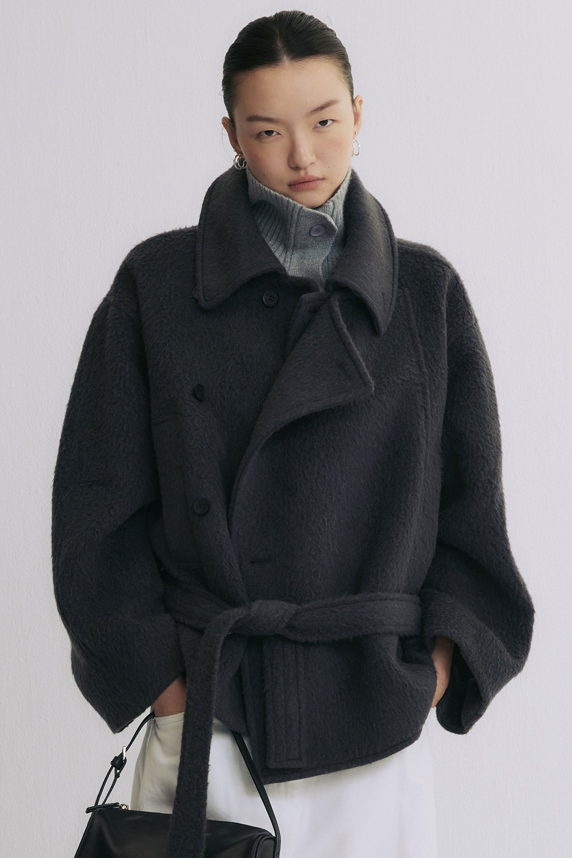 挺闊版型結合慵懶廓形,打造出修身卻不拘束的冬日造型。領口可立可翻,隨心變換風格;同布腰帶與加寬袖袢,細節中透出復古調性,既有設計感亦實穿耐看。