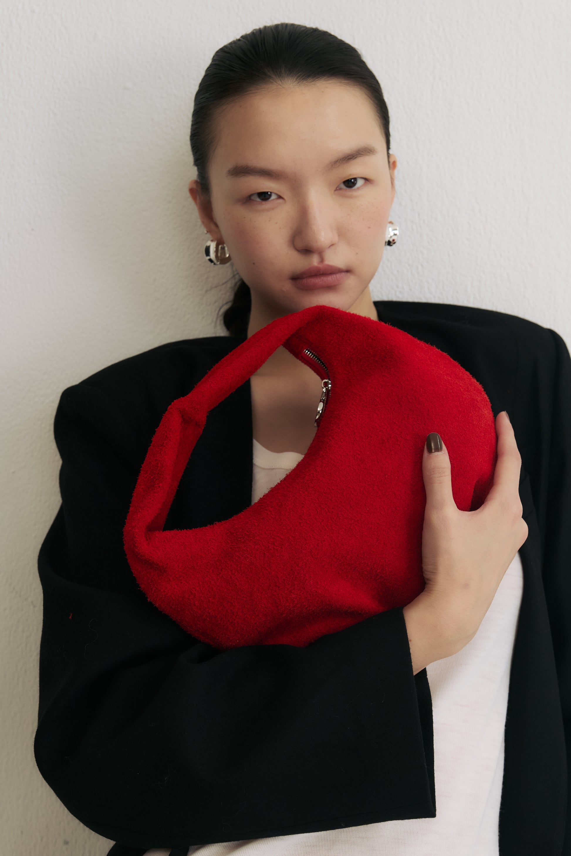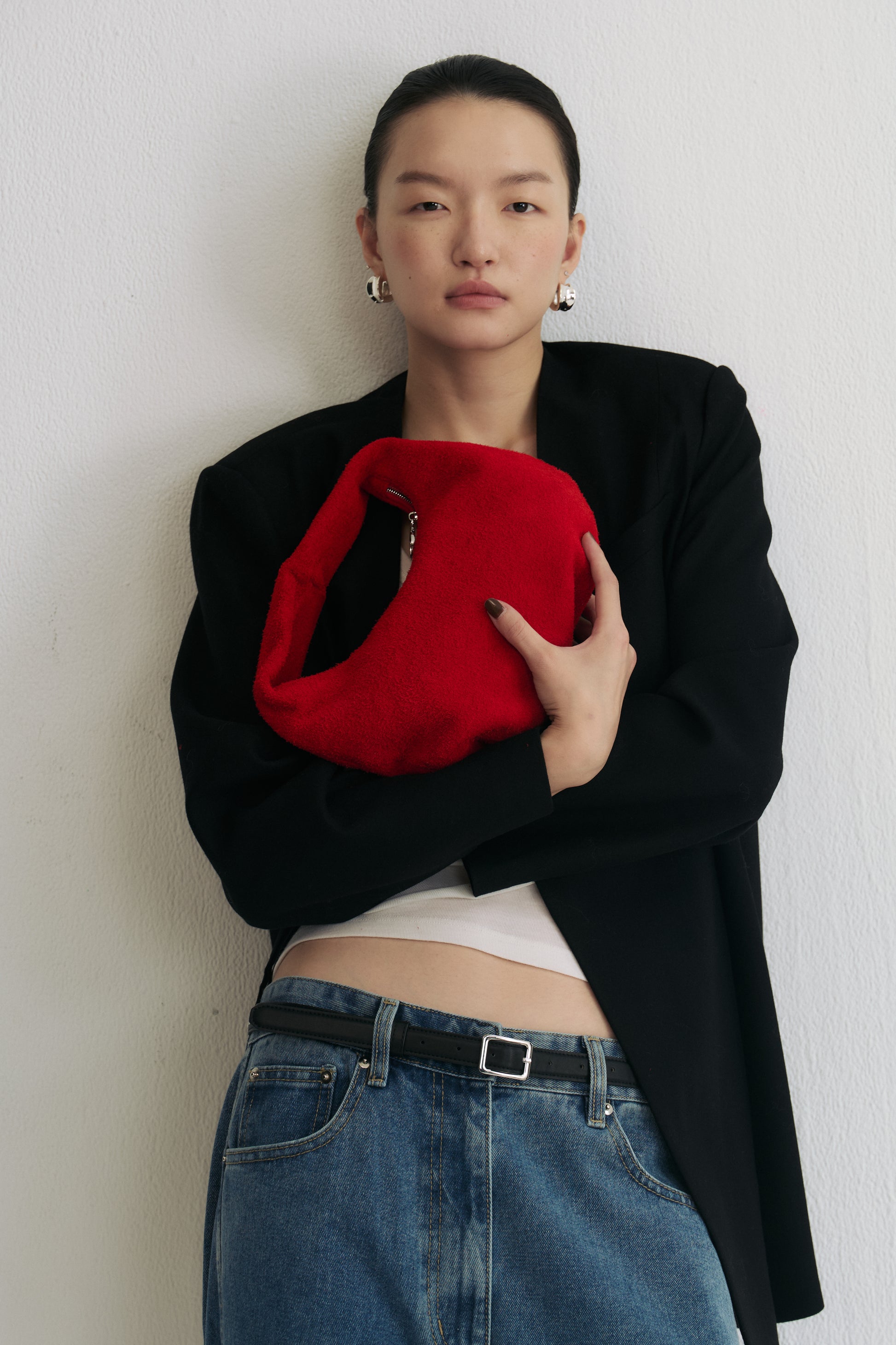 SLO 弯月包採用 100% 頭層牛皮(牛反絨)製成,觸感柔滑並帶有細膩絨感。經多道精細打磨,呈現均勻的復古絨毛與低調光澤。飽滿立體的弧形包身,既小巧精緻又能滿足日常收納需求,輕鬆兼顧通勤與休閒。環保染色工藝賦予飽滿鮮亮的紅色,為秋日造型注入恰到好處的亮點。